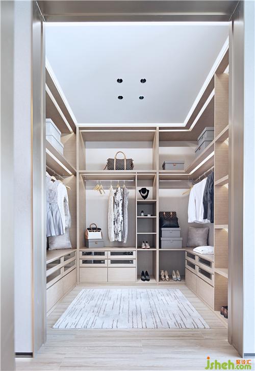 步入式衣帽間,U形柜體掛衣量大,無門設(shè)計讓空間更開闊。