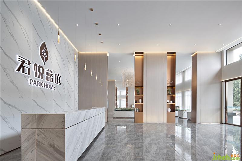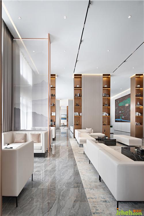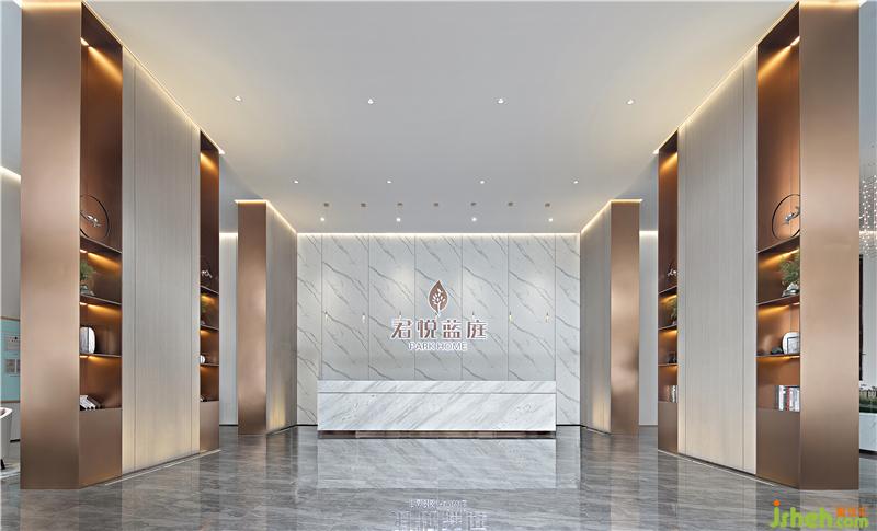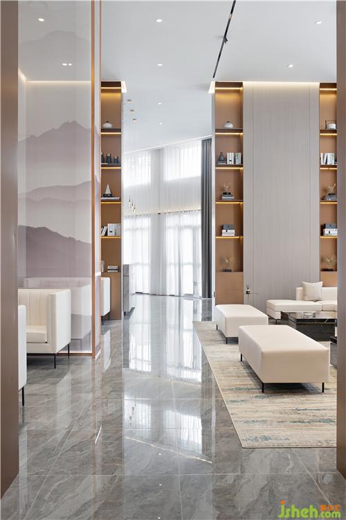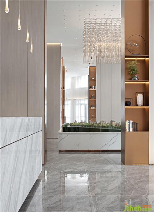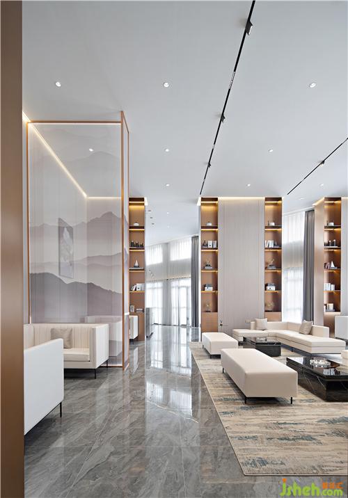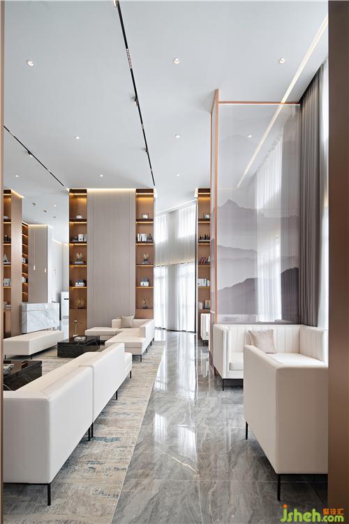前臺一側(cè)望去,隔斷后面有層次的空間延伸從視覺效果上擴大面積,給整個營銷中心增添了一份奢華之氣。