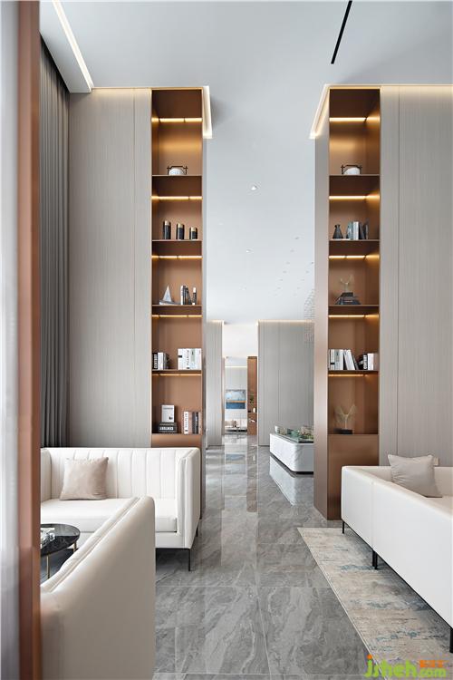 雙層隔斷櫥柜的設(shè)計增強了空間的層次感,空間延綿不斷之感沖擊著視覺感官。前臺與展示臺的材質(zhì)形狀的統(tǒng)一保持了整體風(fēng)格的奢華簡約。室內(nèi)設(shè)計師
