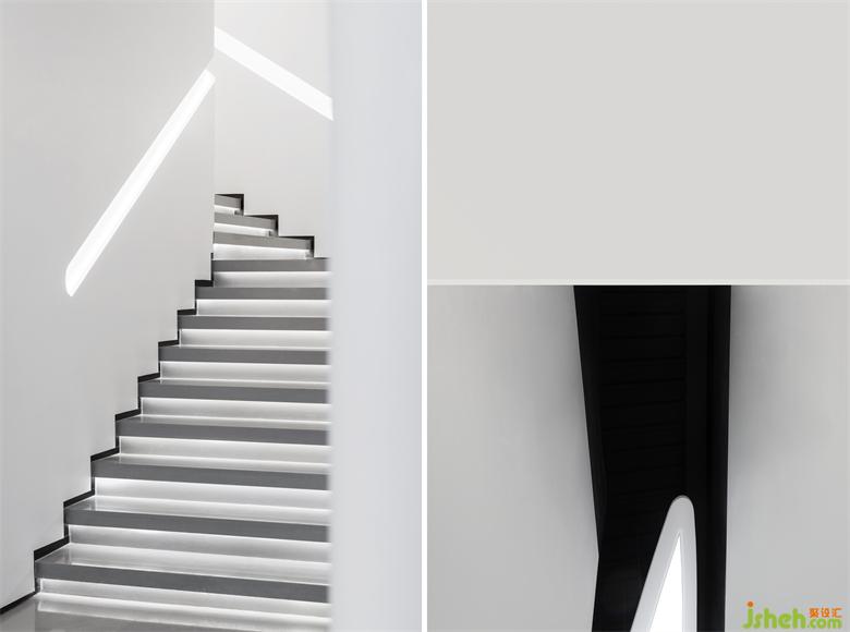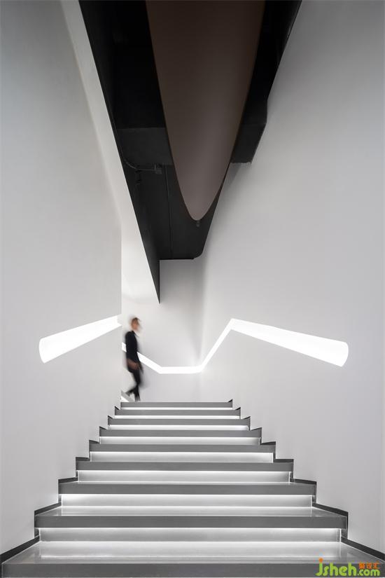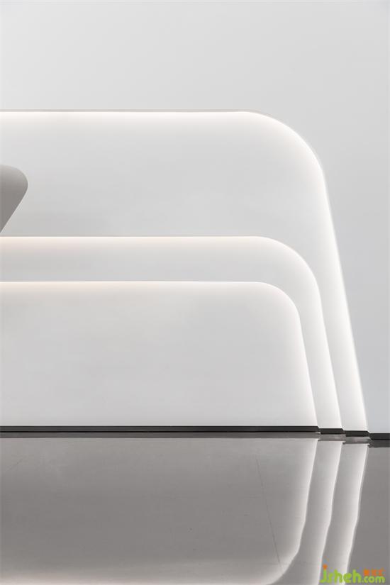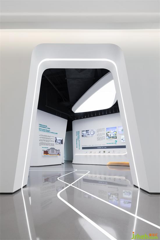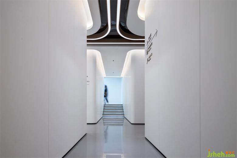 流線形燈光漫延分布于整個(gè)空間,光與線條的微妙聯(lián)動(dòng),既指引空間的游走動(dòng)線,也象征著一種速度與時(shí)代精神,展廳設(shè)計(jì)光的感知與自由流動(dòng)賦予建筑和空間旺盛的生命力。