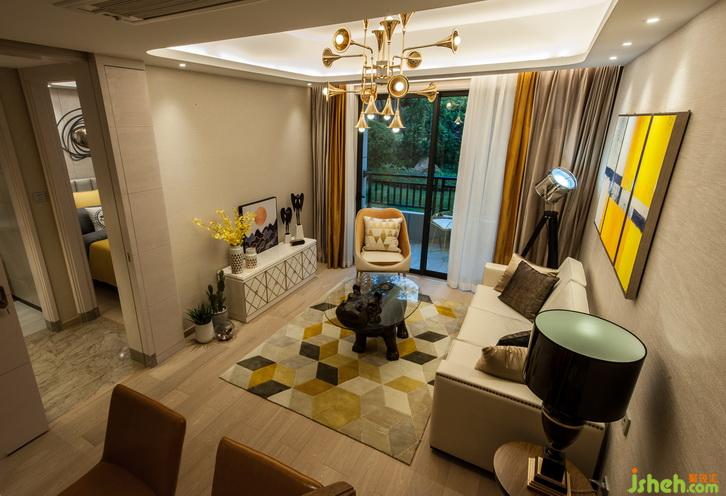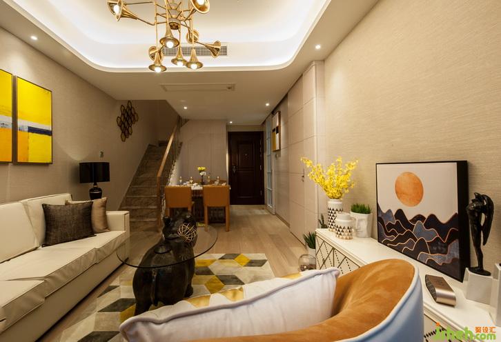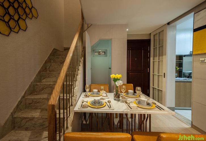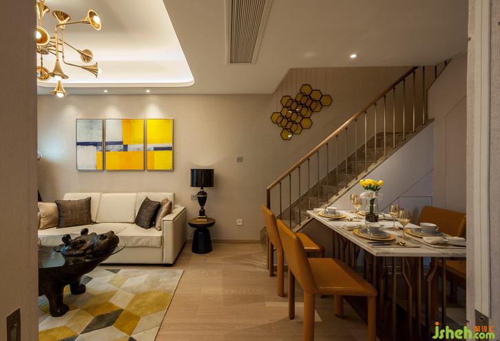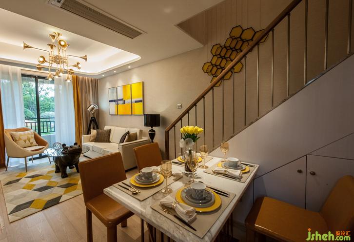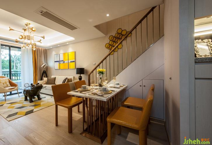 玄關(guān)空間受到設(shè)計師的格外重視,因為這里是家的第一印象、主人待客的第一門戶,更是由外而內(nèi)的心理過渡,能直接帶來歸屬感的風(fēng)水寶地。設(shè)計師在入戶處設(shè)計了鞋柜,功能上能方便主人換鞋、掛衣、放鑰匙雨傘等,空間上則圍和出一個溫馨的通道。樓梯下方的空間則華麗變身為海量儲存空間,成為收納系統(tǒng)重要的組成部分。樓梯造型和儲物柜門通過暗門的方式融為一體。客廳主色調(diào)為暖白色,木飾面墻面、墻布及素色布藝窗簾遙相呼應(yīng),營造出簡潔溫馨的空間效果。天花采用倒圓角造型設(shè)計,配合獨特的金色喇叭燈飾,頓時畫龍點睛般點亮了整個空間環(huán)境。地面采用天然木紋地板,配合幾何花紋的暖色地毯,和諧而統(tǒng)一。家具主要以淺色調(diào)為主,安靜而美好。明黃色抽象派墻面裝飾畫讓整個空間氛圍跳躍起來,使客廳空間溫馨不乏活躍,安靜卻又靈動。室內(nèi)設(shè)計師