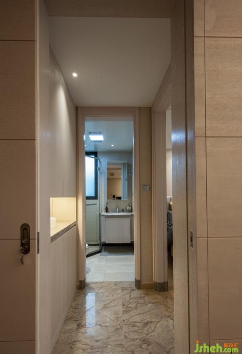 一層洗手間設(shè)計采用了1+1模式,即白天+黑夜模式。白天為結(jié)合客廳、餐廳等公共空間為公共洗手間,夜晚關(guān)上洗手間和客廳之間的推拉門,則成為老人房套房的一部分,方便老人夜間使用,即使早起也不會影響樓上年輕人的生活。洗手間入口走廊處見縫插針的設(shè)計了一組儲藏柜,吊柜下裝有一組柔和的燈帶,避免刺眼和眩光,方便夜間使用。同時洗手臺上也設(shè)計了一組鏡柜作為收納空間。充足的收納空間體現(xiàn)出設(shè)計對使用者無微不至的關(guān)懷。整個盥洗空間采用干濕分離,盡顯人性化設(shè)計,同時采用偏高級棕的暖色系,體現(xiàn)出家的溫暖貼心和潔凈舒適。室內(nèi)設(shè)計師
