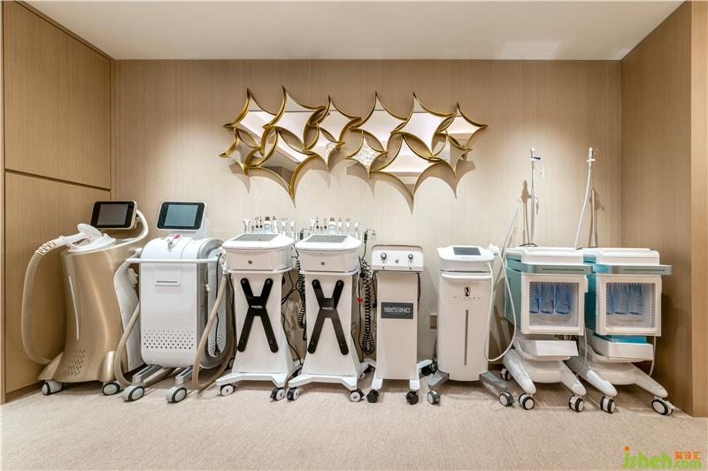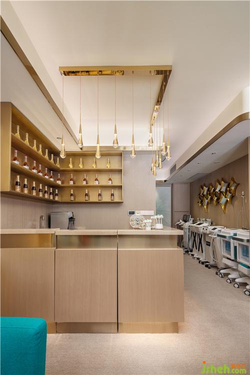 客人一出電梯,映入眼簾的是金色拉絲鋼板造型,水晶發(fā)光字“術(shù)妍美”LOGO,推開高大氣派的銅門,是簡約精致的前臺接待,業(yè)主在前臺上空特別挑選了女人味十足的輕奢裝飾水晶燈。深圳美容會所設(shè)計(jì)前臺左邊是一排整齊擺放的各種進(jìn)口醫(yī)療美容器械,休息等候區(qū)更是被不銹鋼產(chǎn)品展示架一分為二,方便業(yè)主接待不同的客人。小吧臺小巧精致,吧臺上方晶瑩剔透的吊燈更讓會所別有一番格調(diào),吧臺后整齊擺放各式各樣的果酒及調(diào)味酒。業(yè)主為客人精心準(zhǔn)備了各式糕點(diǎn)、精心燉煮的燕窩、現(xiàn)磨咖啡等,給客人提供尊貴的服務(wù)。美容顧問室更是洽談和社交的私密空間,U型辦公臺方便美容顧問工作,旁邊小水盆更是特別貼心,每次和客人做皮膚檢測時,先洗手,客人也更加覺得衛(wèi)生、放心。