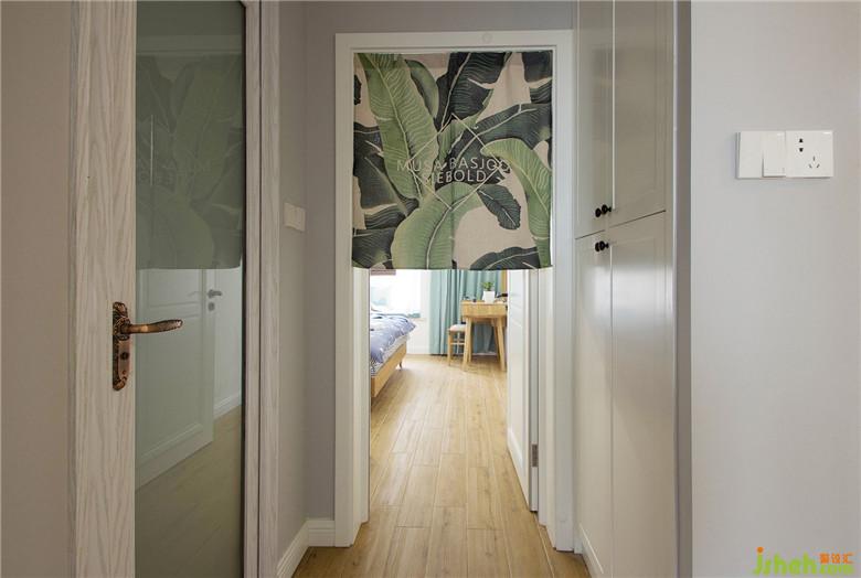 左邊是衛(wèi)生間,右邊是電視墻后的儲(chǔ)物柜,撥開門簾就是主人房。