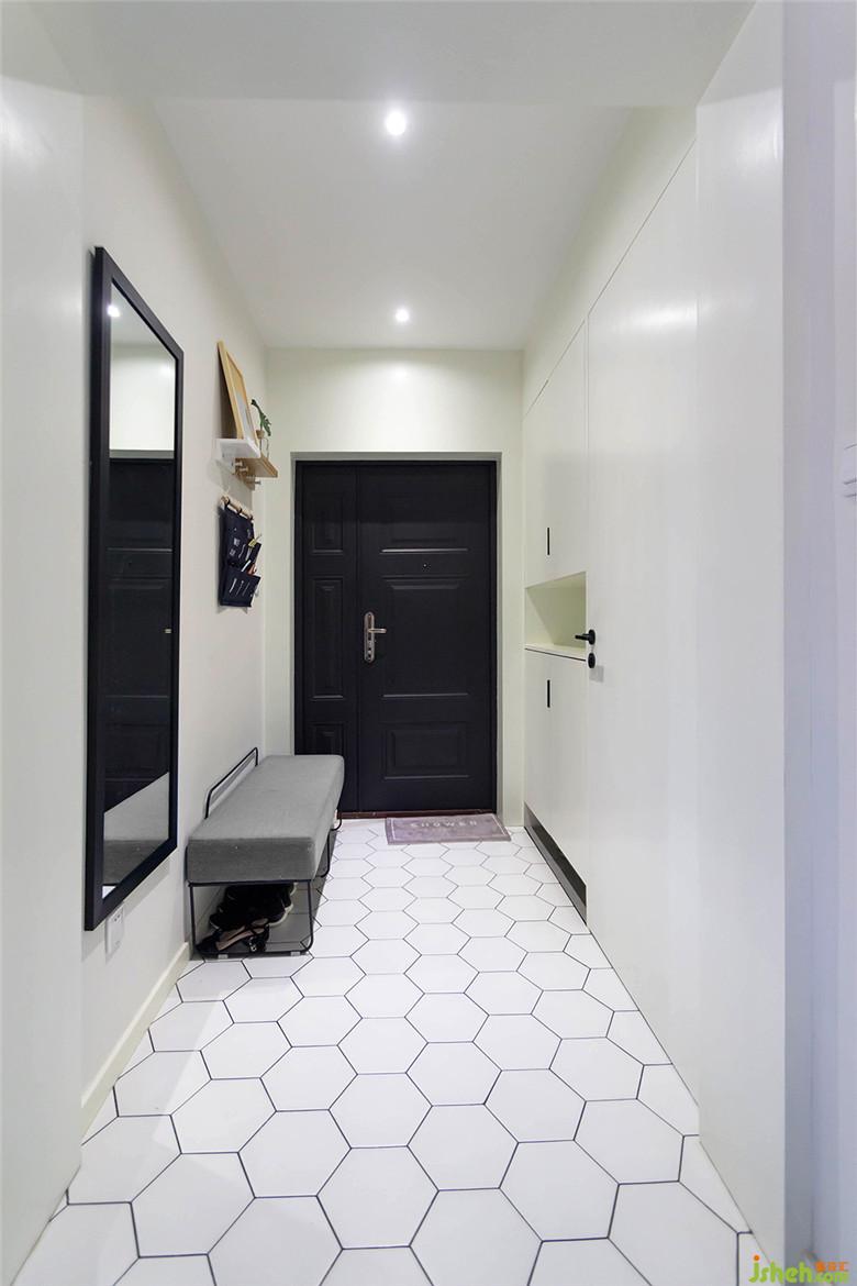 玄關(guān)區(qū)的六邊形地磚有地毯的效果,與灰色地磚形成對比,功能分區(qū)明顯。