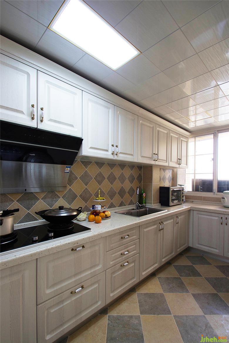 ▲ 廚房用灰藍與淺咖色的亞光磚搭配,空間干凈明亮