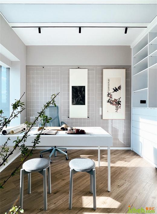 背景墻用上了精心設(shè)計(jì)過的定制網(wǎng)格圖案面板比例方格玻璃便于男戶主可以構(gòu)思畫作構(gòu)圖,并用磁性玻璃覆蓋,讓男戶主可以輕松“掛”起初稿藝術(shù)品,調(diào)整尺寸和框架。墻上掛上男戶主最珍貴的藝術(shù)收藏“藍(lán)瑛”的作品。