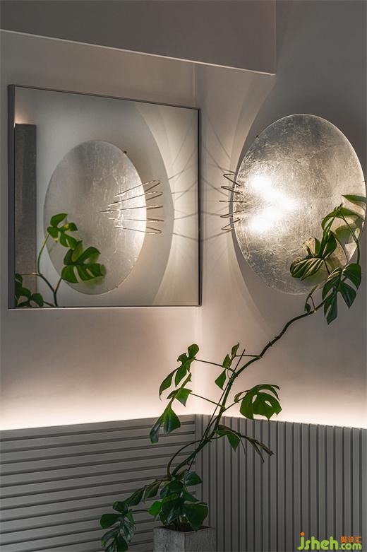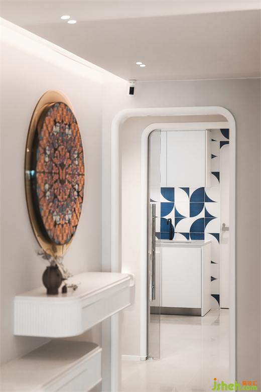 2.由玄關(guān)延展至飯廳的掛墻柜,以圓弧造型與層架及吊燈設(shè)計(jì)互相呼應(yīng)。