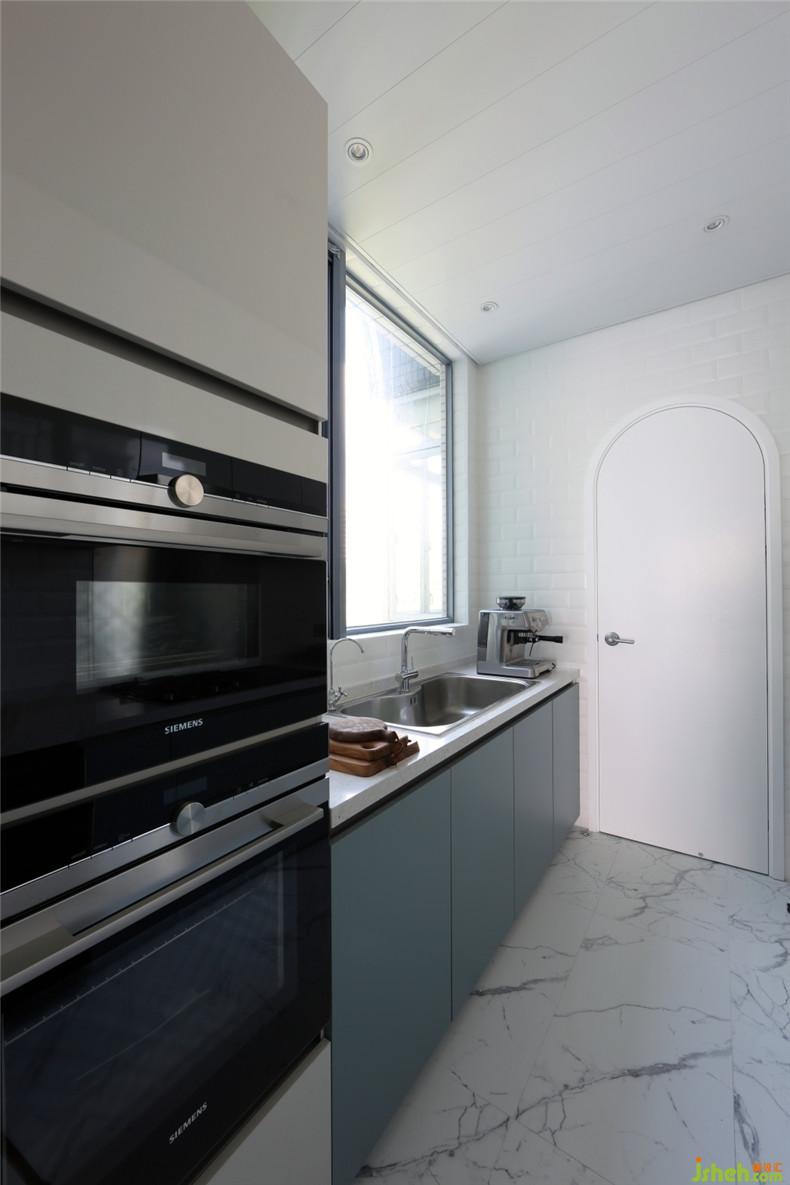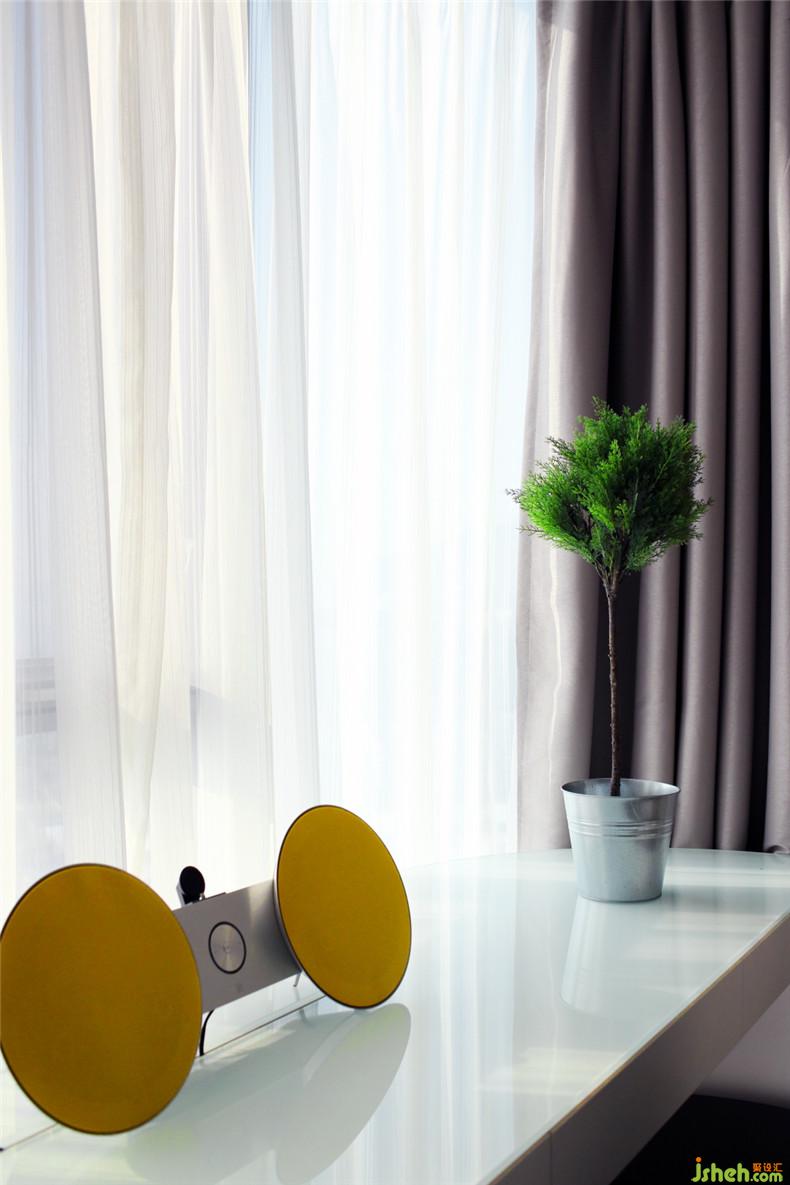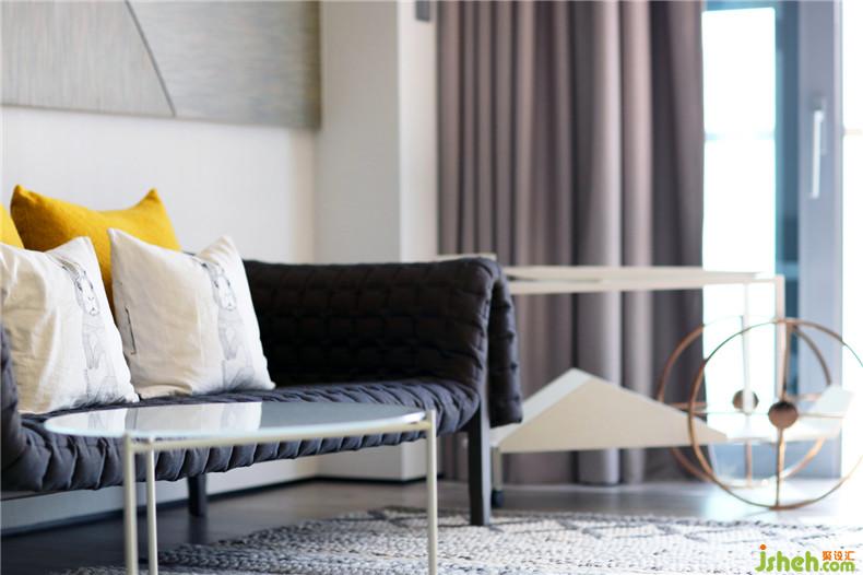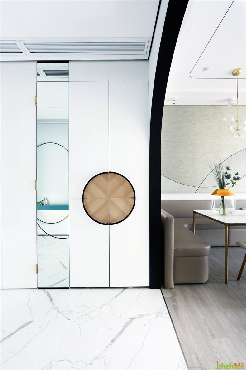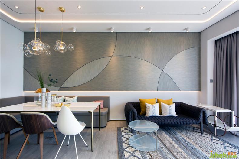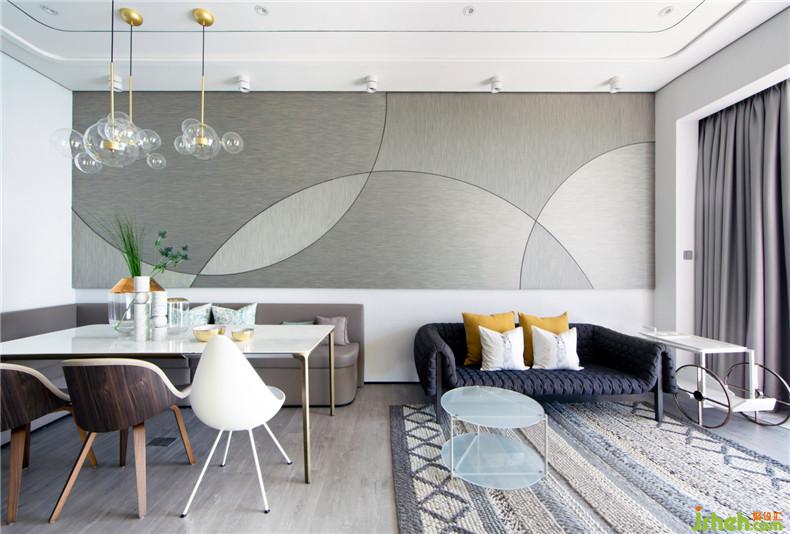 客廳與餐廳的區(qū)域劃分保證了空間的整體性,占據(jù)了一整面墻的全高置物柜,室內(nèi)設(shè)計(jì)師最大程度的保證了空間的開闊,特色的暗紋墻紙?jiān)诠耖T上帶給你不經(jīng)意的驚喜。沙發(fā)背后的墻面通過(guò)大小不同的弧形設(shè)計(jì),墻紙紋理在光線下表現(xiàn)出深淺不一的顏色對(duì)比,靜謐中帶著一點(diǎn)跳躍,加以金屬條的配合,手法干凈利落??蛷d落地窗把陽(yáng)光與新鮮帶進(jìn)室內(nèi),讓室內(nèi)外相融成趣。
