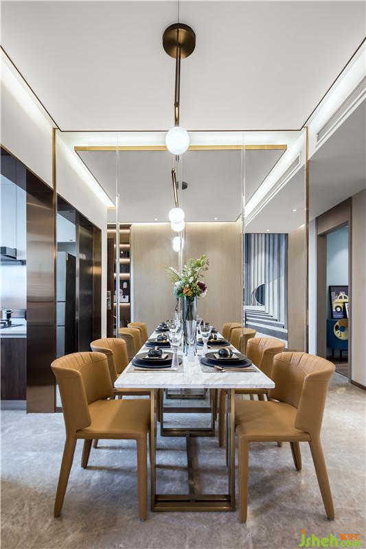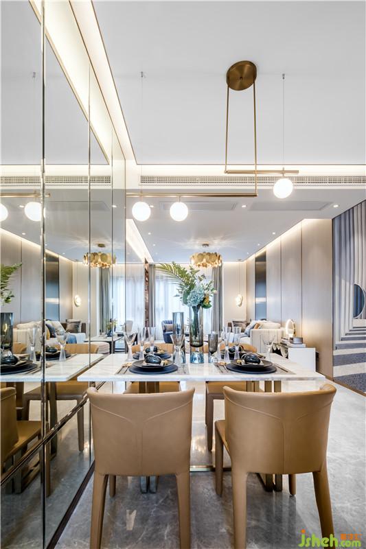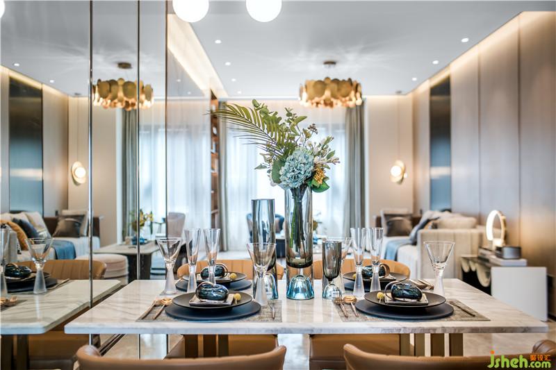 在最能體現(xiàn)生活儀式感的餐廳空間,金屬、玻璃和鏡面材質(zhì)的粲然光感完美交融,營(yíng)造出空間的優(yōu)雅美好,凝結(jié)著都市生活的輕奢享受。