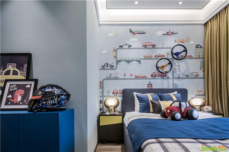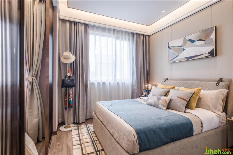次臥的床品軟裝陳設(shè)與背景墻的掛畫在色彩和形式上呈現(xiàn)自然呼應(yīng)關(guān)系,輕微的撞色,簡(jiǎn)約不鑿的塊面組合,共同形構(gòu)出時(shí)尚而溫馨的空間魅力。