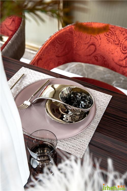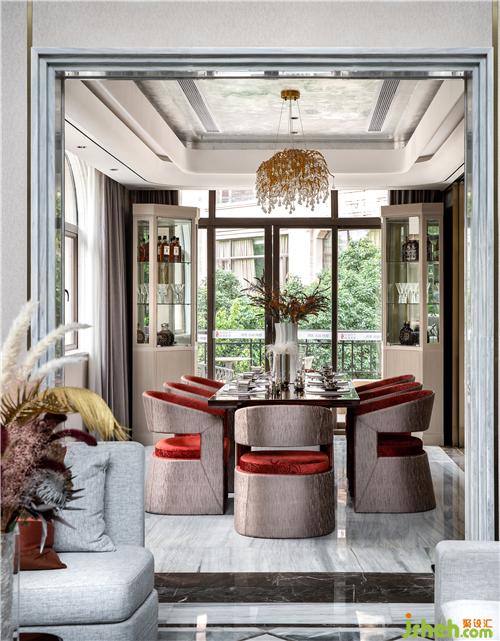 折衷美學講求比列均衡,注重形式美,設計師將這種特質(zhì)于餐廳空間中加以重點呈現(xiàn)。整體空間涵容著一種閑適的自信、沉淀著優(yōu)雅的韻致,墻面板與裝飾畫的搭配保留了一絲古典的豐神情韻,紅色靠椅搭配流光溢彩的餐桌和西式餐具,演繹日常生活的豐瞻之美。
