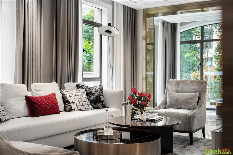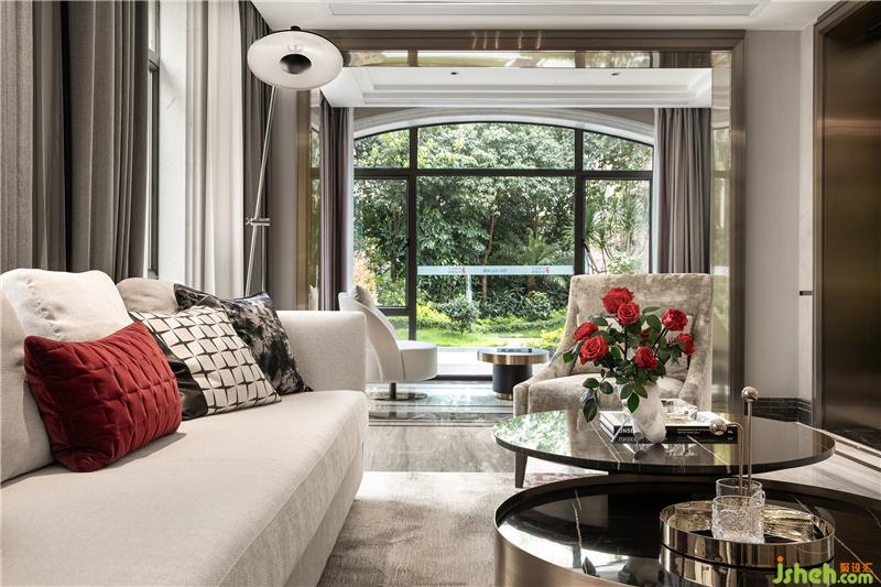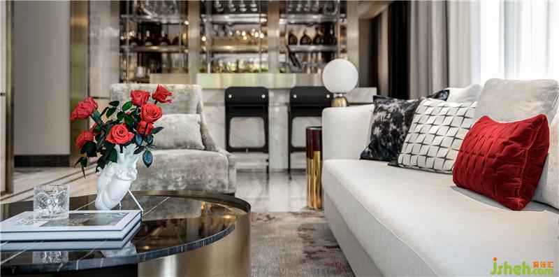 負(fù)一層會客廳整體通透大氣,品質(zhì)感的家具擺設(shè)與硬裝搭配得天衣無縫,設(shè)計師希望借由簡約而不簡單的組合,讓優(yōu)雅格調(diào)和氣質(zhì)美感彰顯于空間各處細(xì)節(jié)。方正的空間中,圓弧形巧妙置入,讓品味空間多了一絲柔軟,一抹鮮紅則綻放著生活的熱情,于不經(jīng)意間流溢出不凡品味。