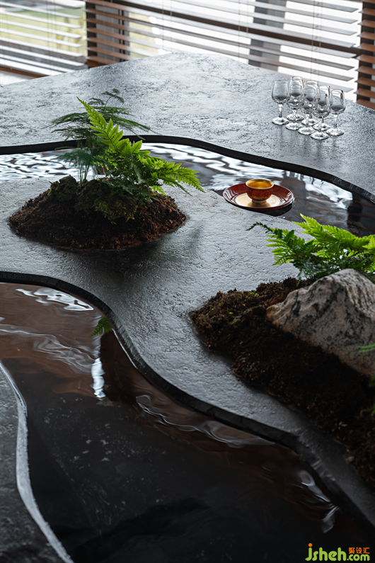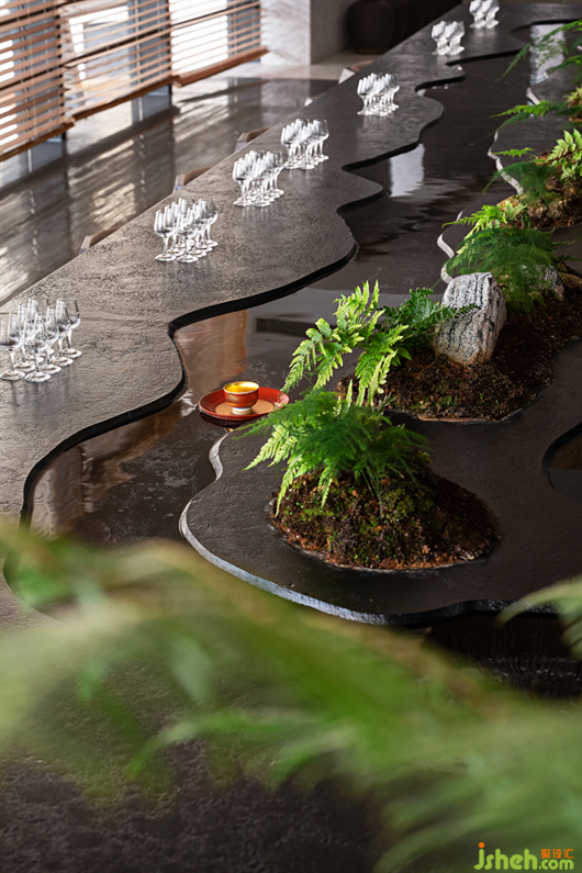 魏晉時期,名士自有風(fēng)流。永和九年三月初三,蘭亭雅集,被后世傳為千古佳話。之后曲水流觴便成為文人聚會時的一種水畔飲酒行樂的活動。在本案空間中,SEPD圣易文設(shè)計將傳統(tǒng)文化中“曲水流觴”的概念引入到辦公樓設(shè)計中,將清泉、流水、綠苔等引入室內(nèi)空間,用現(xiàn)代的語言重新演繹古人在溪水河畔飲茶、吟詩、作畫的文人雅興。