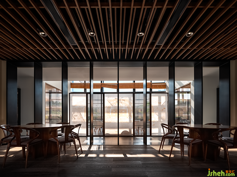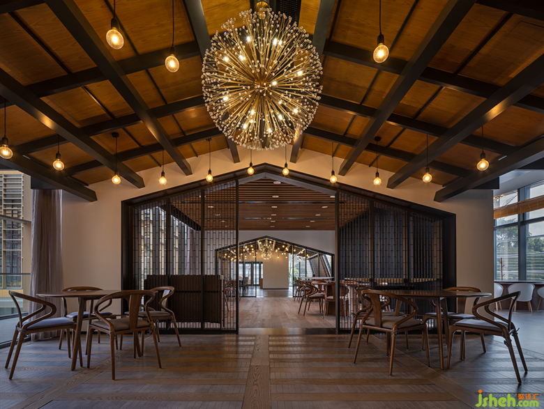 在這里,設(shè)計師特意營造一個舒適清和的就餐空間,也為日常休息時相互交流、情感溝通等提供了一個富有生活滋味的放松場所。設(shè)計將天然色系引入空間,整體自然清雅,中與西、新與舊互相融合,營造出和諧的空間氛圍,無論是木飾還是黑色鐵藝,中式風(fēng)靠椅還是現(xiàn)代感的吊燈,無不服務(wù)于空間整體和諧清雅的氣質(zhì)。