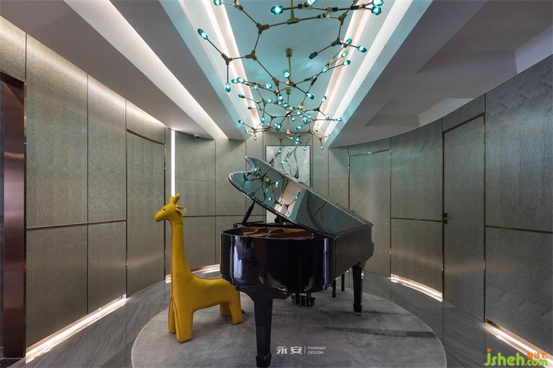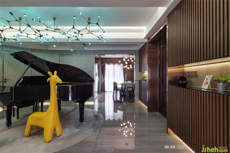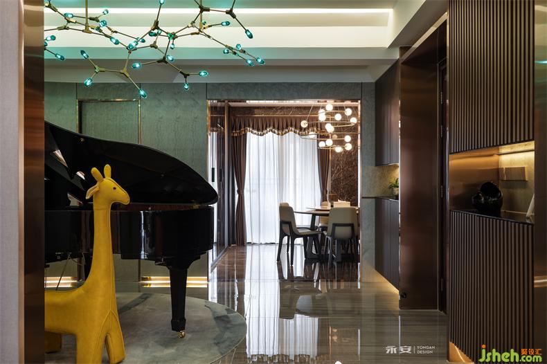 入戶玄關,色彩融入雀眼木色整體搭配古銅色。深圳豪宅設計經(jīng)典百搭的灰色系與光芒四射的金色截然不同,正是這種強烈的反差印象,留給人無限的對家居的遐想與探究意趣。三角鋼琴的擺設,不僅提升了整體空間的藝術性,更讓氣氛渲染的大氣端莊。