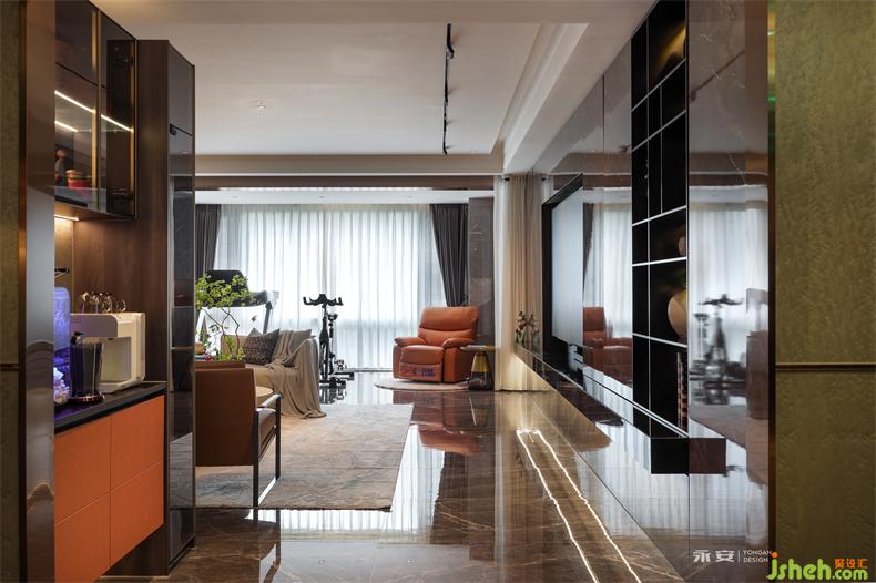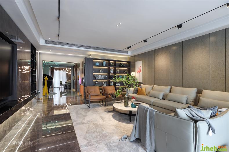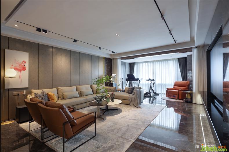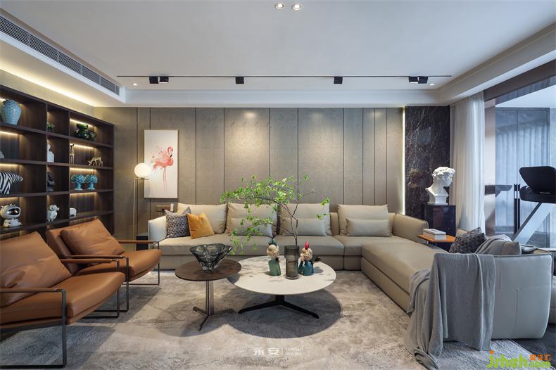 本案深圳豪宅設計風格為現(xiàn)代輕奢風格,采用時尚精簡、低調內斂的高級灰是用于家居裝扮的首選基調色彩,呈現(xiàn)優(yōu)雅魅力和精致大氣的視覺感官,符合人們對現(xiàn)代生活的審美需求。同理,作為潮流都市代表色之一的雀眼木色,居家設計中的運用中,讓空間張揚不浮夸、經(jīng)典且時尚,成為永恒不變的奢侈品味。
