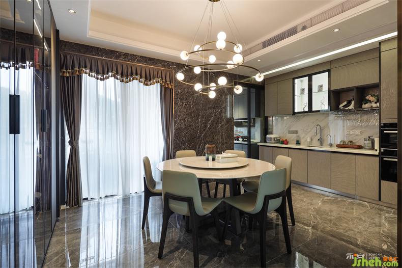 開闊明餐廳,軟裝設計強調審美在外質感在內,深圳豪宅設計與客廳同源的背景裝飾畫為空間注入輕盈靈動氣質。充滿設計感的餐桌、翠綠色餐椅傳遞優(yōu)雅儀式感,醞釀出現(xiàn)代詩意。天然大理石臺面搭配具有裝飾線條感及簡約、節(jié)省空間的桌腳設計,有助于于餐椅的擺放使用方便性。