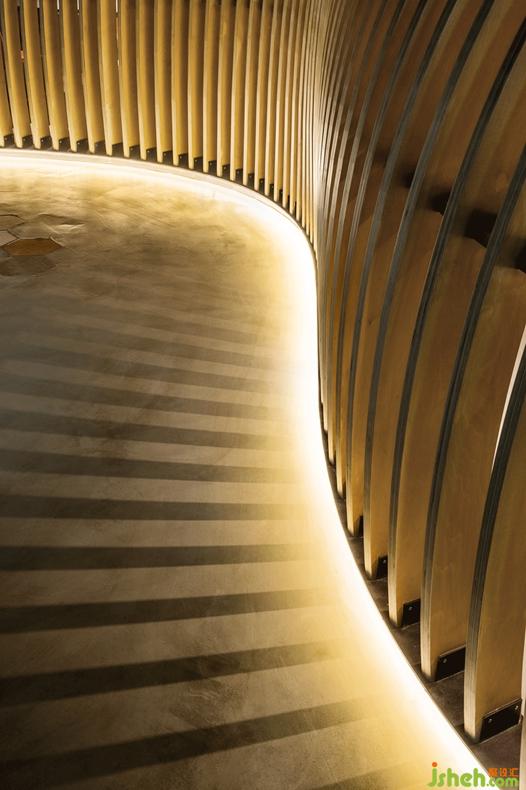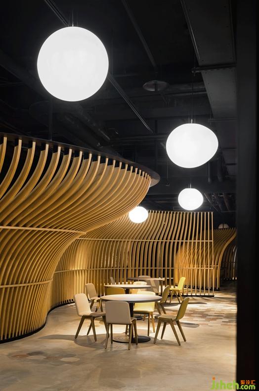 靈感的火花需要精密的計算才能實現(xiàn),設(shè)計師以一種特殊的曲面木格柵系統(tǒng)置入這個空間,經(jīng)過數(shù)位與結(jié)構(gòu)精密的計算,產(chǎn)生出一種仿自然的韻律與美感。