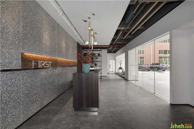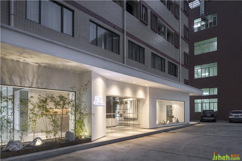 新建的廠房外墻貼的是淺棗紅色瓷片,是傳統(tǒng)板式建筑,沒(méi)有亮點(diǎn)。所以我們決定先改頭換面,采用白色乳膠漆涂刷整塊墻面,干凈整齊。并將整個(gè)立面切分成五塊,兩邊保留樓梯通道,正中間是展廳正門,正門旁邊打開(kāi)兩面落地窗,比起原始結(jié)構(gòu)有更多的采光,也更加通透。設(shè)計(jì)公司