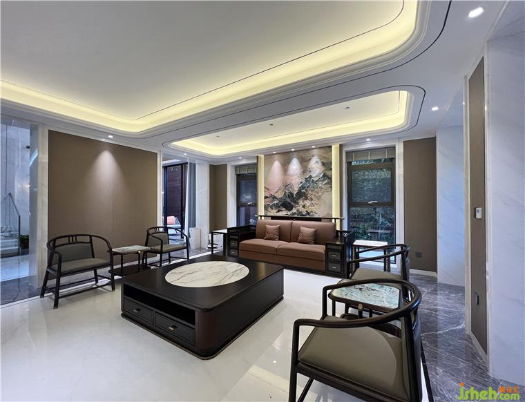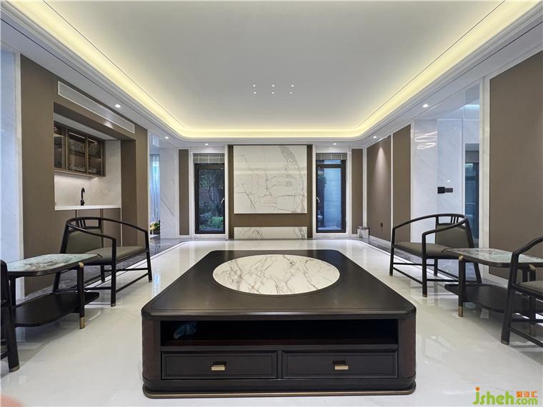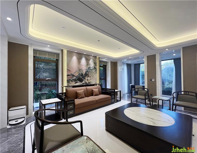 客廳采用大面積落地窗設(shè)計(jì),梧桐書舍設(shè)計(jì)讓窗外層巒疊嶂的山水景觀一覽無(wú)余,將柔和情調(diào)展現(xiàn)得淋漓盡致,讓業(yè)主能夠享受生活中難得的浪漫詩(shī)意。