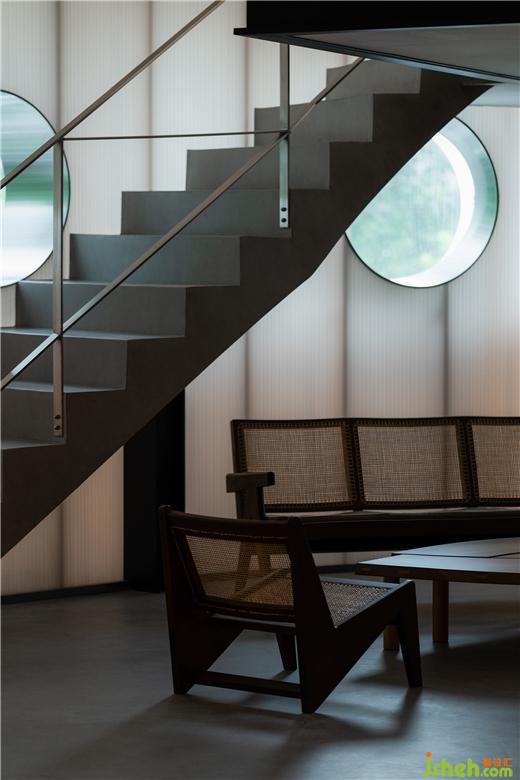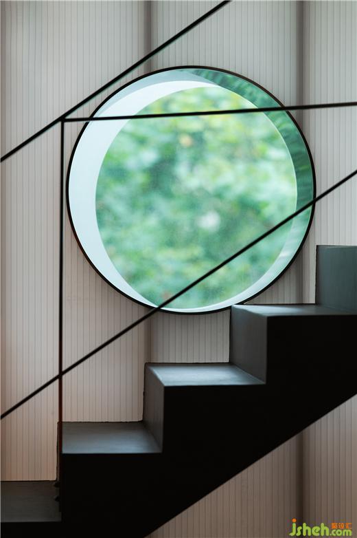 藝術(shù)的魅力在于自我的剝離與疼痛的嵌入。這個(gè)內(nèi)嵌于水泥梁柱之間的巨型玻璃圓洞,既充當(dāng)了空間視覺在上下關(guān)系中回來(lái)穿透的路徑,也成為了作用于酒精與刺青之間剝離與疼痛的象征。