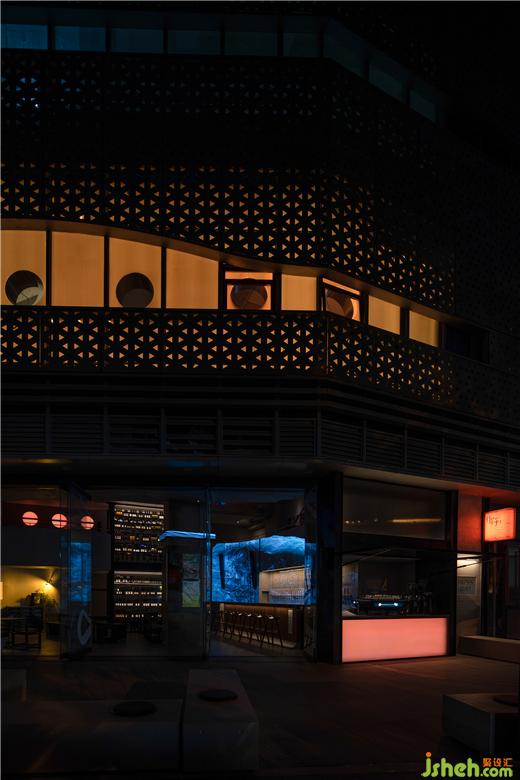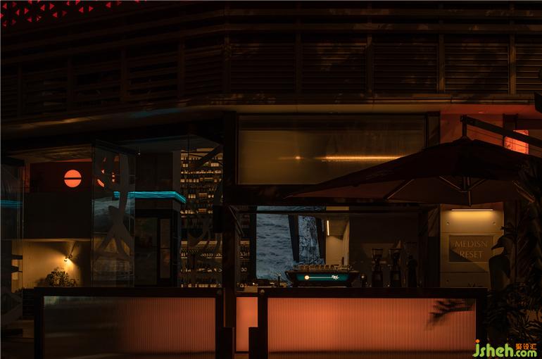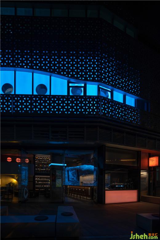干凈、克制的灰色水泥墻面,一改白日的沉默氣質(zhì),成為空間視覺藝術(shù)無(wú)處不在的載體,為藝術(shù)氛圍的表現(xiàn)發(fā)揮著空間整體性與適應(yīng)性的作用,充當(dāng)了畫布與容器的雙重功能。
