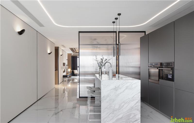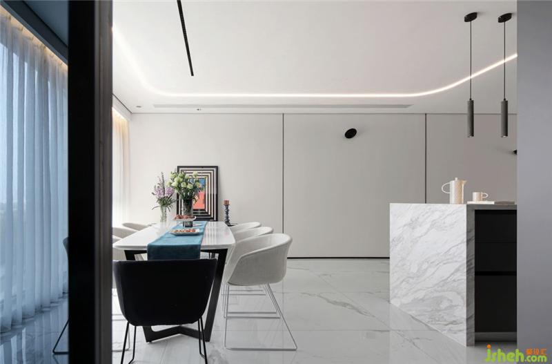 東方自然語(yǔ)境與西方表現(xiàn)主義融合,構(gòu)建空間“海納百川,有容乃大;壁立千仞,無(wú)欲則剛”的精神氣質(zhì)。延續(xù)客廳部分有一個(gè)自由空間:開(kāi)放式茶室或書(shū)寫(xiě)室。被地面抬高的木地板作為空間界定,雖為獨(dú)立空間,卻無(wú)私密的遮擋,刻意設(shè)計(jì)在客廳與餐廳之間。設(shè)計(jì)師的用意是借空間自由式連接,是他提出“空間是自由的”結(jié)論。自由中人的行為及動(dòng)作自覺(jué)性的完成,盤(pán)坐或靜坐正是中國(guó)傳統(tǒng)修心養(yǎng)生的一種方式,以達(dá)到人的“禪定”。上方的人字斜頂將光藏在夾縫里,反射在空間范圍,仿佛一道撫慰的光,指引著人的內(nèi)心深處。溝通“人與天地”,感悟生活的寫(xiě)實(shí),需要一種自覺(jué)的放松。