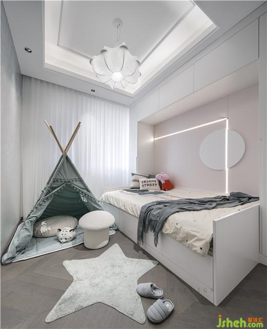 兒童房以低飽和度的粉色營造溫柔舒適的睡眠空間。床的擺放讓坐在床上的人能一眼珠江夜景,家裝設(shè)計(jì)堪稱完美。這也不無體現(xiàn)主人對生活的無限向往。