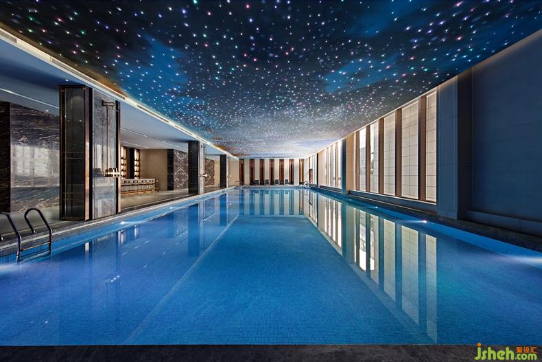 值得一提的是游泳池空間,玻璃幕墻與室外空間自然銜接。天花由精致星空彩繪與數(shù)百顆光纖燈彼此融合、映襯,仿佛置身于神秘的宇宙星辰,使得空間更加富有靈氣且充滿意趣。當(dāng)夜幕降臨,透過幕墻與星空交相輝映,愉悅動(dòng)人。
