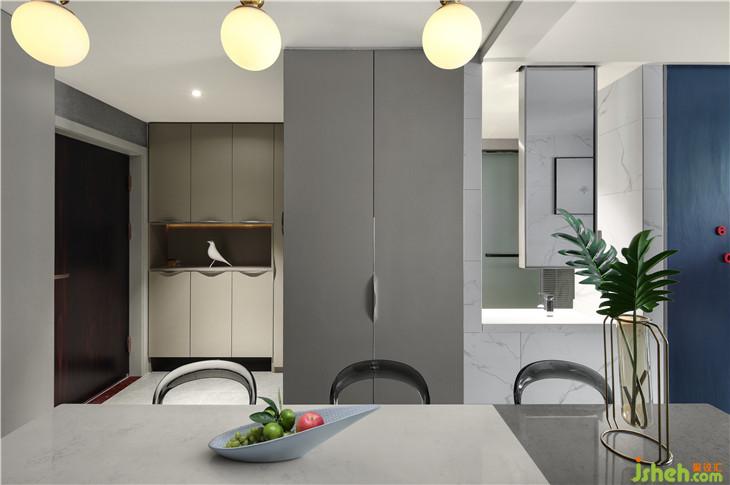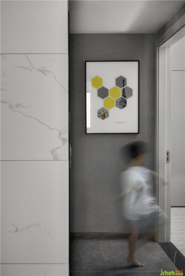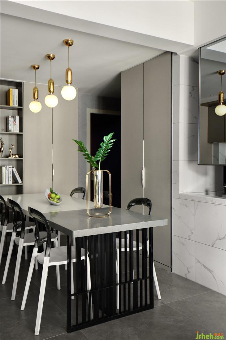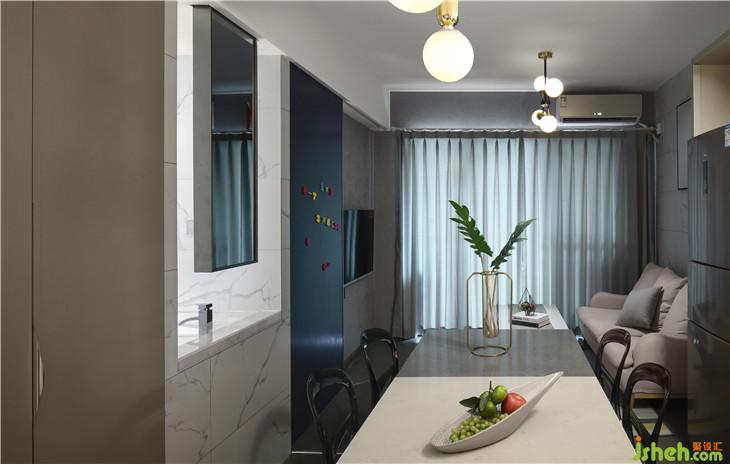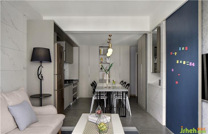 空間規(guī)劃了入戶玄關(guān)區(qū)、就餐區(qū)、兒童游樂(lè)區(qū)、沙發(fā)區(qū)、洗簌區(qū),倆臥室、衛(wèi)生間、陽(yáng)臺(tái)。入口是一個(gè)玄關(guān)區(qū)域,原結(jié)構(gòu)大門(mén)直對(duì)這臥室門(mén),臥室門(mén)又直接對(duì)著窗戶,這在風(fēng)水上是忌諱的,所以設(shè)計(jì)一個(gè)玄關(guān)區(qū)域,一盆綠色植物讓空間充滿了靈動(dòng)。餐桌是自己定制的,2.3米長(zhǎng),分為兩部分,就餐區(qū)及裝飾區(qū),灰白大理石的臺(tái)面及定制的黑色鐵架腳。沒(méi)事的時(shí)候就跟孩子在桌面上玩游戲,很好。一扇移動(dòng)的深藍(lán)色黑板推拉門(mén),連接了兒童游樂(lè)區(qū)及沙發(fā)區(qū)域,客廳電視藏在背后,想看電視的時(shí)候輕輕移動(dòng)推拉門(mén),電視就完全呈現(xiàn)出來(lái)。餐桌旁特意制作了個(gè)柜子,做為孩子的收納柜,孩子玩好玩具,就收納在柜子里,這樣,就不會(huì)凌亂了。大理石制作的洗漱臺(tái)及懸掛的鏡子,讓采光及通風(fēng)得到了良好的作用。