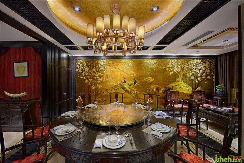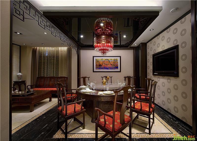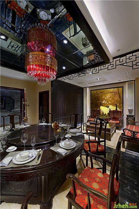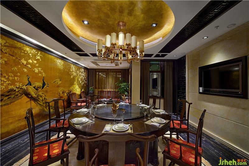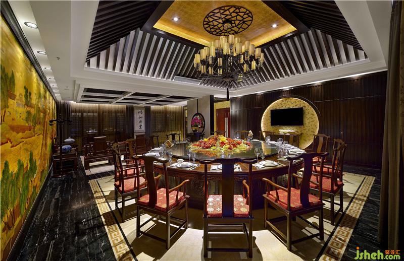 沿著黑色大理石樓梯緩步至二層,墻上實木窗格中裝飾的青花瓷盤創(chuàng)意獨到。它在深沉的色彩里投下一抹清明,一樓休閑平臺的山水畫卷屏風被燈光映襯的靈動、高貴,既啟到了中式設計手法中的虛實結(jié)合,又充分提升了空間的藝術(shù)氣息。至于二樓大大小小的包廂各有特色,或雍容典雅,或清麗脫俗。中庭兩側(cè)包廂是設計師重點打造的部分,用窗欞面對中庭,讓在此包廂中用餐的尊貴客戶,能透過中式窗花的窗子,看見貫穿的一二樓中庭空間,別有一番意境。