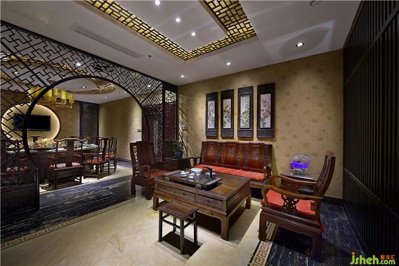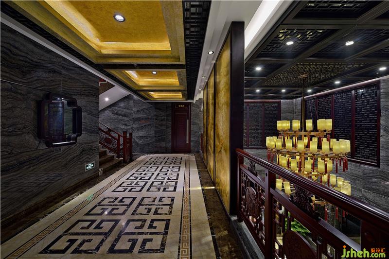 福臨門會所的大門被塑造成古時私家宅院的樣式,靜靜地坐落在繁華吵雜的都市中。門前高掛的大紅燈籠、朱黑的匾額、燙金的題詞,兩側(cè)石鼓豎立綠植郁郁蔥蔥,讓人不禁期待藏匿在門后的那個神秘的空間。推開厚重的鑲著如意銅扣的紅木大門,眼前不由一亮。一扇仿古雕花窗格木屏風半遮視線,高達兩層樓的挑高有著天井一般的效果。這里懸掛的大型吊燈,凸顯大氣風范。墻面、地板均使用天然石材裝飾,黑色、米白色、金沙色拼貼出的紋樣干凈沉穩(wěn),并孕育著空間不可或缺的氣度。
