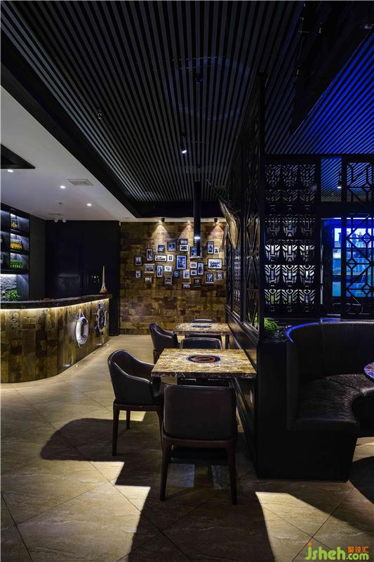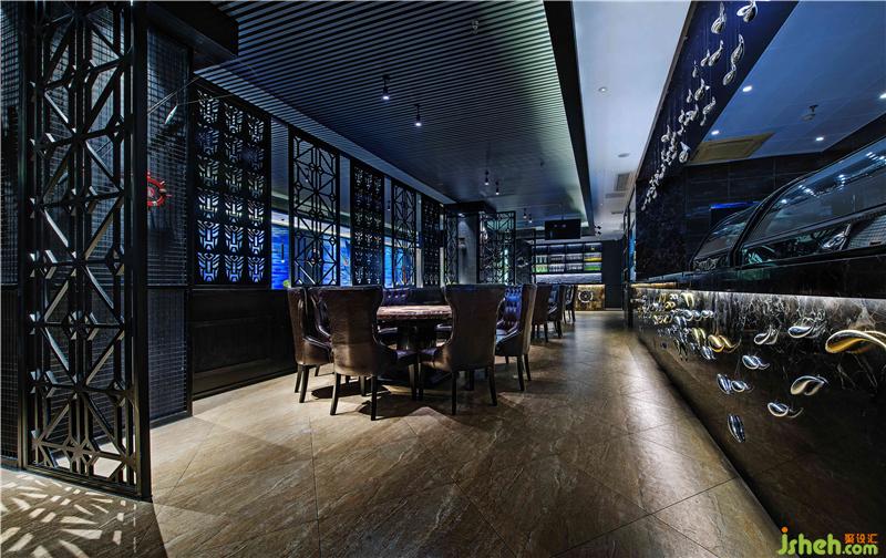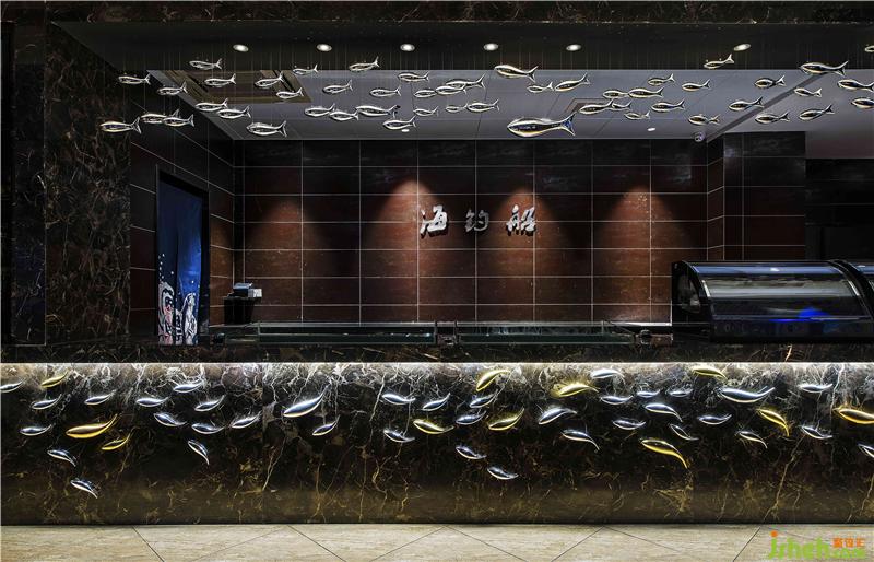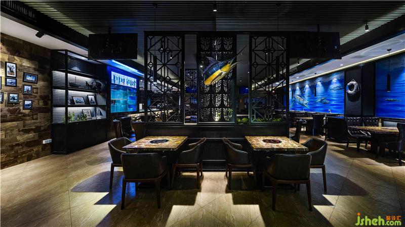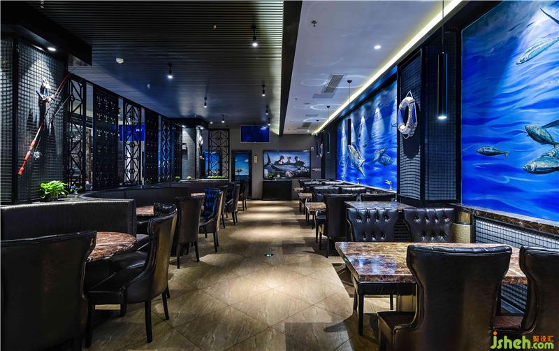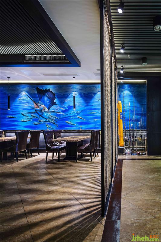 海釣船主題餐廳以“海洋”為主題,海洋藍(lán)色,寧?kù)o、神秘、新奇帶給人像大海一樣不可測(cè)度的神秘感喝魅力,通過(guò)對(duì)原有環(huán)境的精心規(guī)劃,結(jié)合環(huán)境及周?chē)ㄖ耐庥^,融入現(xiàn)代的設(shè)計(jì)手法和色彩搭配,使整體海釣船餐廳籠罩在一片優(yōu)雅的海洋中,遠(yuǎn)離城市的嘈雜和喧囂。海釣船餐廳大門(mén)運(yùn)用深灰瓷磚倒角斜拼,類(lèi)似深海礁石營(yíng)造一種即將進(jìn)入深邃的大海,去探索海洋的神秘的氛圍,讓顧客不由自主想要去探索。進(jìn)入大廳運(yùn)用麻繩、原木、救生圈、船舵等元素營(yíng)造出身在甲板上的氛圍,墻面藍(lán)色色彩對(duì)比的3D噴繪,與整體較柔的燈光效果結(jié)合,加上店家實(shí)際出海捕魚(yú)的視頻播出,使顧客真實(shí)直面感受大海的親和力及活力,從而使顧客在這里享受放松,休憩身心回歸大自然的體驗(yàn)。