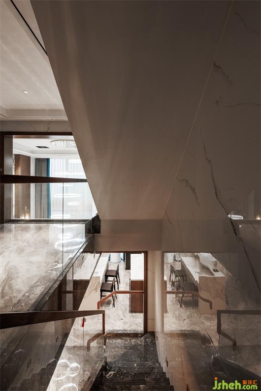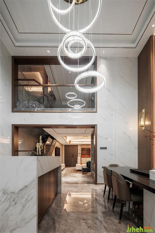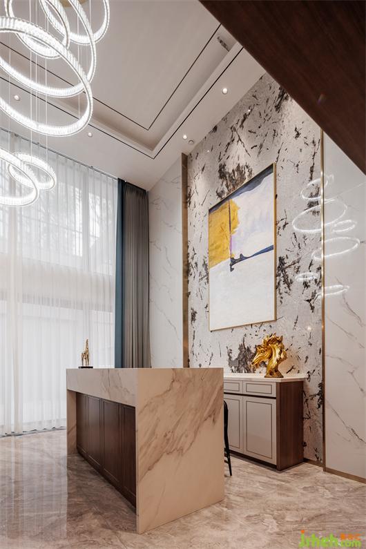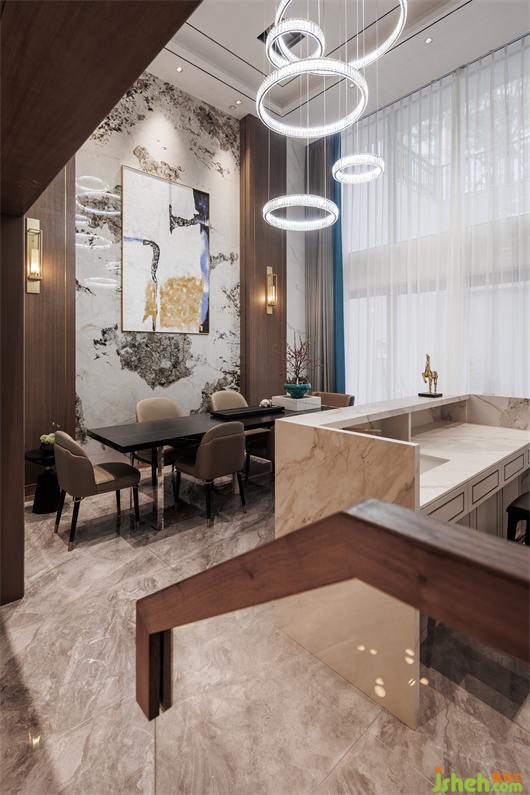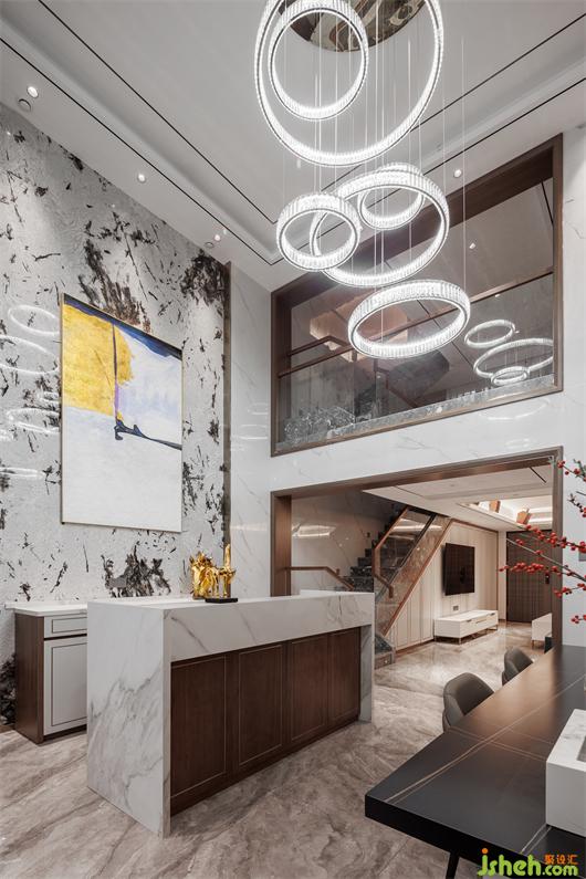 開放式餐廚空間,簡練線條托起華美肌理,別墅設(shè)計色調(diào)與材質(zhì)呈現(xiàn)珠聯(lián)璧合的疊加魅力,兼以藝術(shù)裝飾調(diào)味精致細節(jié)。