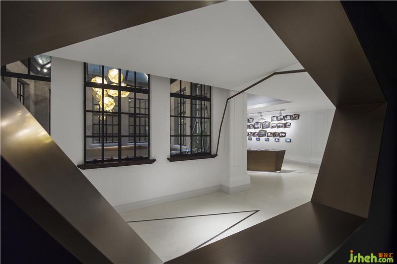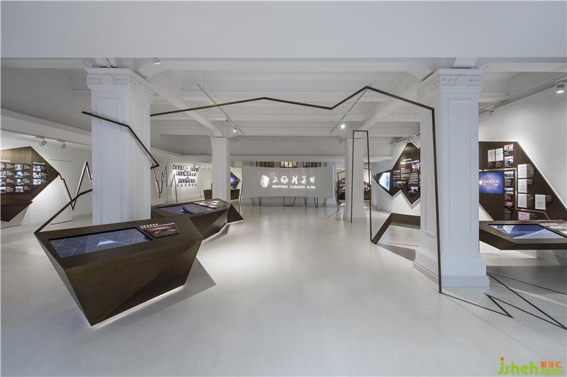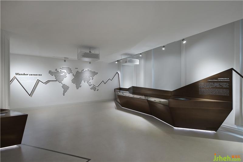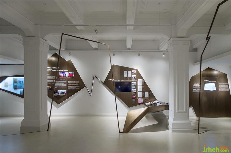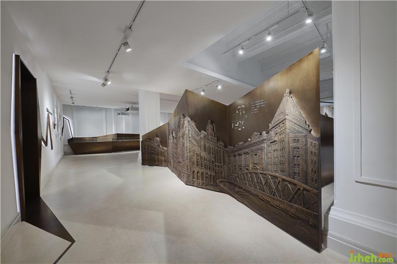 整體空間由V&W趨勢線構(gòu)成,以黃銅作為主體材質(zhì),這是外灘老建筑中的常用建材。入口由趨勢線引導(dǎo),老材質(zhì)與新創(chuàng)意整合成一座時光漩渦,激發(fā)參觀者的期待感。進入館內(nèi)首入眼簾的是一片銅雕的導(dǎo)覽信息,精細雕刻出外灘剪影。展覽引言、導(dǎo)覽地圖、清算機構(gòu)的起源和發(fā)展均以實體形式在觀眾眼前鋪開。從門廳開始,參觀者正式步入清算事業(yè)的歷史回廊,而V&W構(gòu)成的引導(dǎo)線始終伴隨左右。CROX闊合將新的線條運用在舊的建筑物中,同時盡可能保留舊建筑的歷史風貌,新與舊產(chǎn)生出一個對話性空間,這也符合海派文化東西合璧新舊交融的精髓。裝修設(shè)計