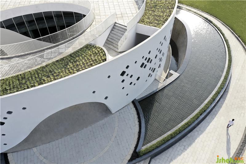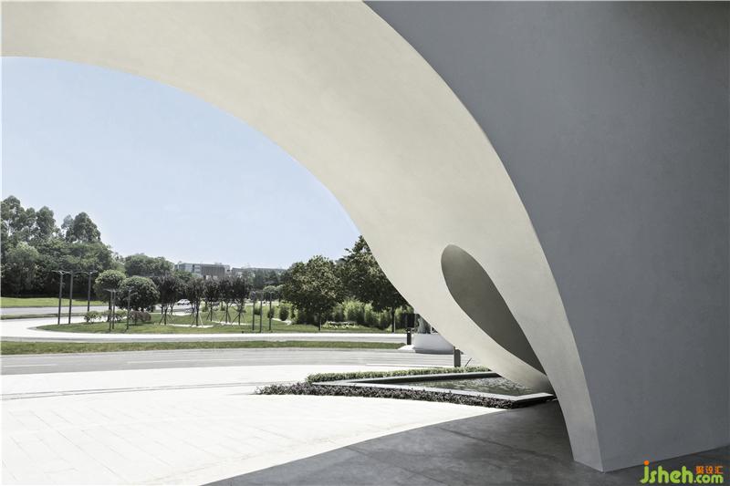 我們在位于成龍大道的主入口廣場上打造了層巒迭嶂的小山丘,如伸出的雙手般進(jìn)行流線配置,并通過地形的高低起伏,過濾面前道路的嘈雜紛擾。蜿蜒的車道設(shè)計(jì),緩和了車行速,轉(zhuǎn)換成輕松閑適的入園心情。規(guī)劃上以人車分流為主,停車場位于建筑人工地盤下;人行的動(dòng)線,則順著景觀流線,由大階梯延伸到園區(qū)內(nèi)。
