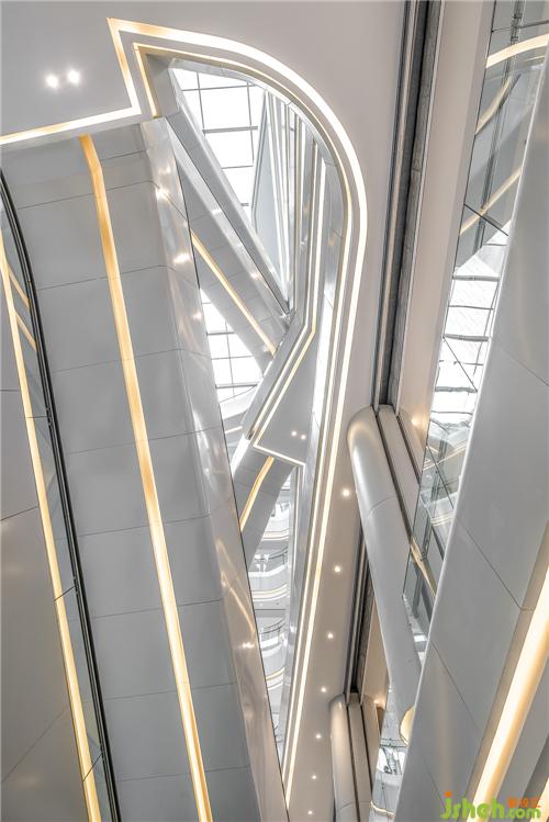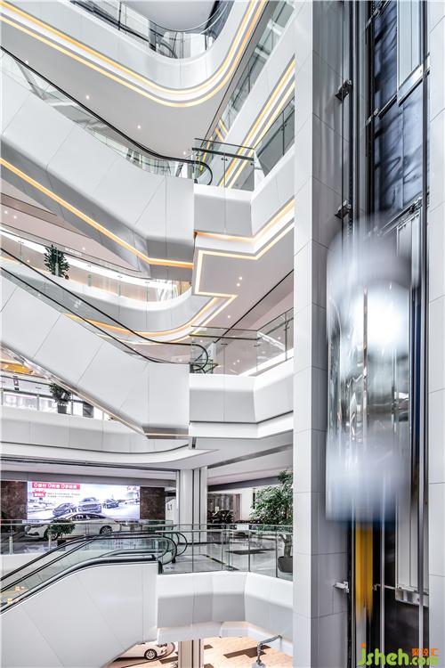 白是所有色光的聚合,亦是所有顏色的缺失,配合汽車烤漆的質(zhì)感,光影的變幻,成為上述轉(zhuǎn)化的途徑。溫馨的暖光源設(shè)計,強調(diào)了線的流暢感,成為有機融入扶梯的線條結(jié)構(gòu),豐富了純白空間的層次,也以指引來處與歸處的隱喻,進一步增強了中庭設(shè)計的現(xiàn)代表現(xiàn)力。