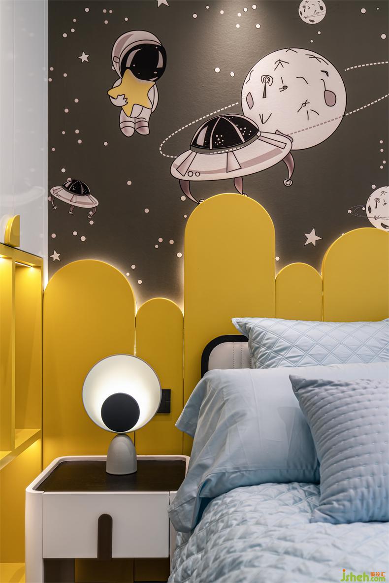 兒童房的設(shè)計從孩童的天性入手,浩瀚星空、宇航飛船和明黃色基調(diào)喚醒了童真與想象。用愛意呵護,陪伴小朋友慢慢長大。