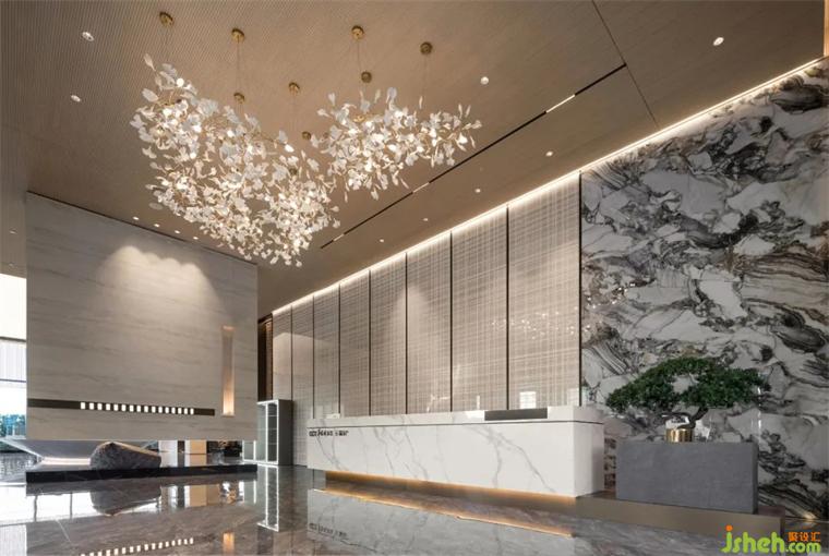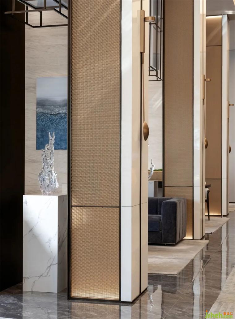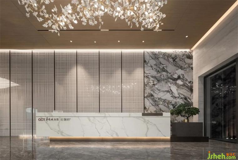 銷售中心入口處,大型裝飾吊燈講述著《香飄四季》春天的故事,花團(tuán)錦簇的古梅暗香浮動,呼應(yīng)著麻涌的風(fēng)物特征,也牽引著人們對美好生活的向往。它與接待臺的天然水墨石紋背景,恍若某種詩意的隱喻,讓美不止于表面,也成為充盈內(nèi)心的力量。