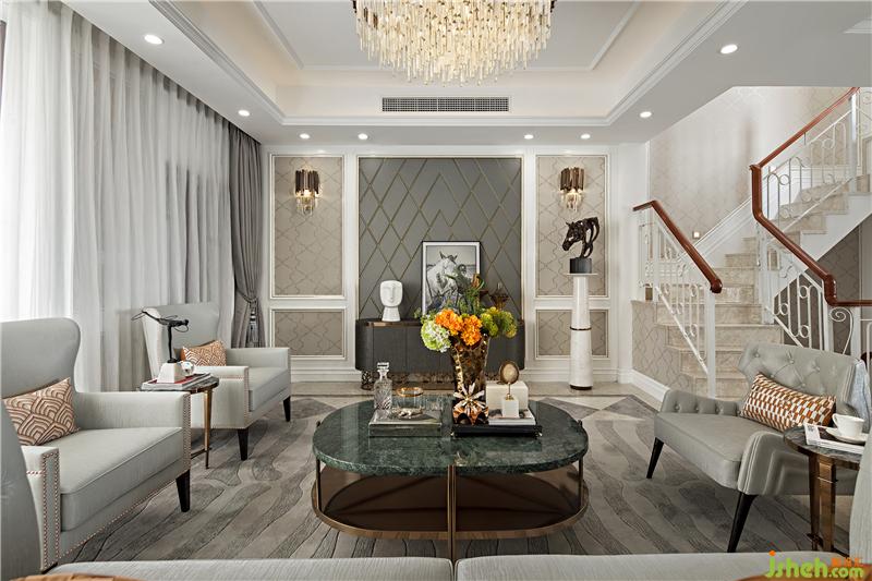 樣板房設(shè)計客廳空間通透明亮,舒適大方,一覽無遺。頂燈絢爛與掛畫抽象,如“了不起的蓋茨比”電影里,鎏金歲月,如夢似幻,亦真亦假。