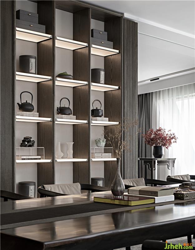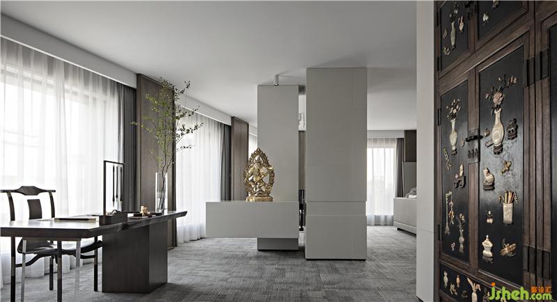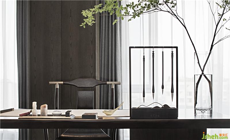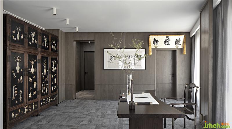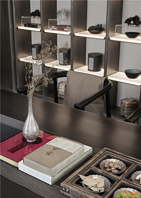 客廳一隅,是中式書房,文房四寶、浮雕立柜,深色原木紋裝飾,會(huì)所設(shè)計(jì)簡(jiǎn)單不失雅致,厚重不失冷靜,端的是鬧中取靜,修身養(yǎng)性。
