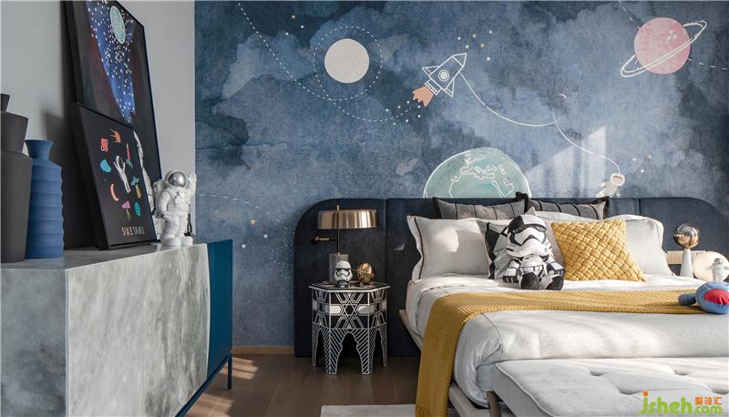兒童房宇宙主題的空間語調融入豐富設計詞匯,樣板間設計裝置藝術品的植入,為整體空間設計增添了奇趣氣息,創(chuàng)造了感官的豐富度的同時,讓空間氛圍達到活潑可愛的氣氛。