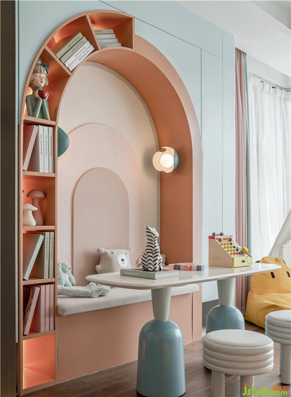 無論是床頭柜,還是墻面裝置,無不流露出對積木拼接的活化運(yùn)用,構(gòu)筑起這個歡樂的童話王國,讓其搭載孩童稚嫩而精彩的夢。為未來描繪無限暢想。