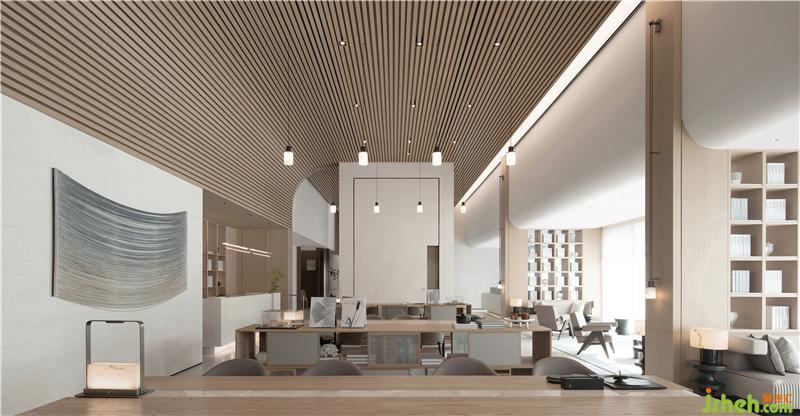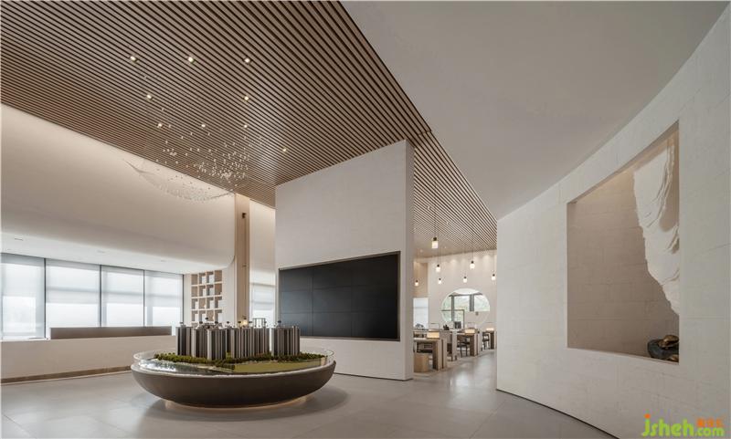 在沙盤區(qū),木格柵船倉貫穿整個(gè)天花,構(gòu)筑極具韻律之感,且伴有變化的光影效果。