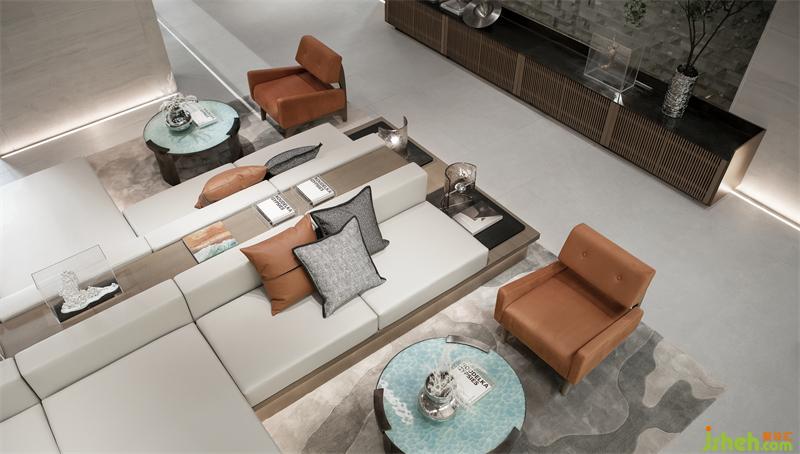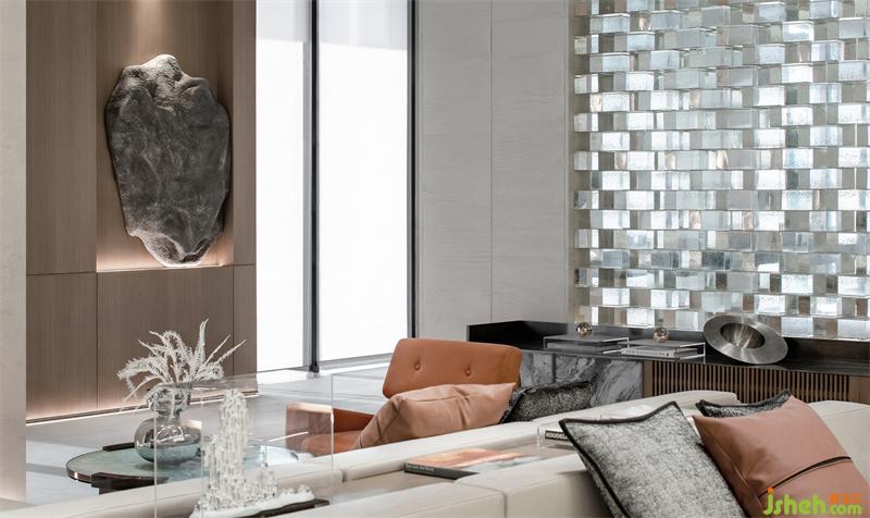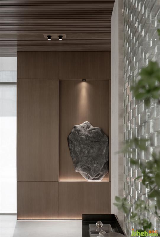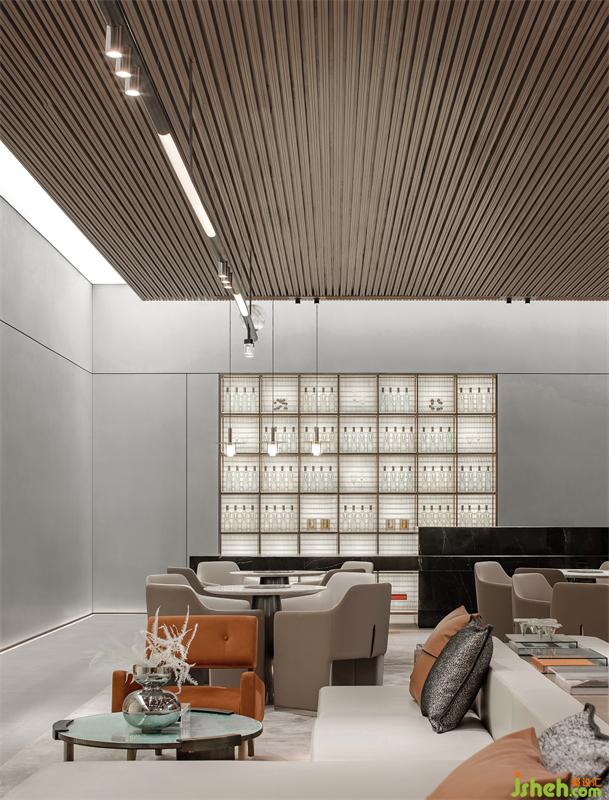 移步向內(nèi),隨著格柵動線的牽引,導入幾何線條,石材體塊的分割,溫暖撲朔的光影,營造潛移默化的序列感與縱深感。搭配線條感十足的燈飾,空間仿佛擁有著生命一般溫潤而自然,以簡潔、干凈回應現(xiàn)代人的理性與克制。