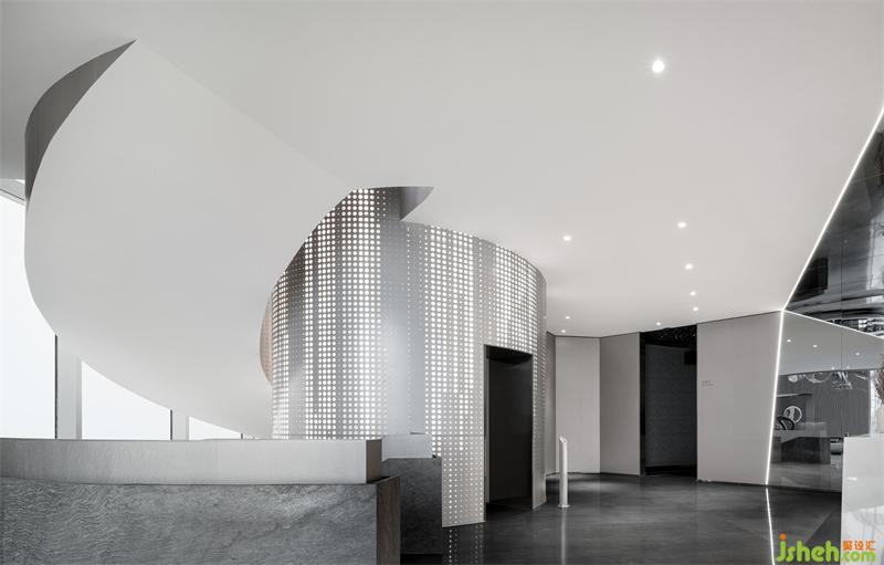 太空旅客上樓邁出信息艙,到達(dá)飛船二層。鏡面不銹鋼材質(zhì)的回字形墻面前,“銀河”傾瀉而下。鏡中河利用德羅斯特效應(yīng)延伸開來(lái),大大擴(kuò)展了二層前臺(tái)空間。雙色透光石臺(tái)面上的LED燈搭配沖孔鋁板,營(yíng)造出萬(wàn)千星河璀璨無(wú)垠的景象。