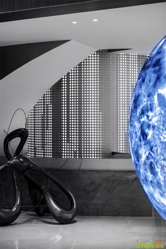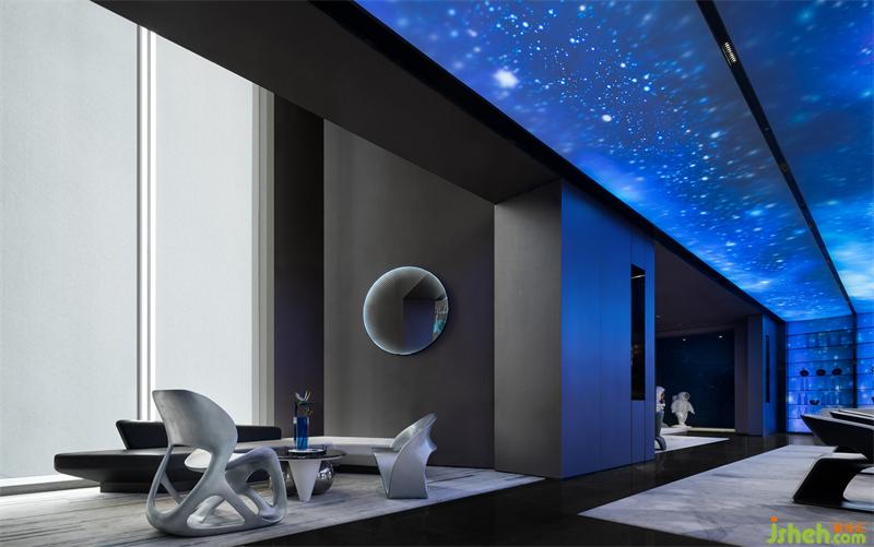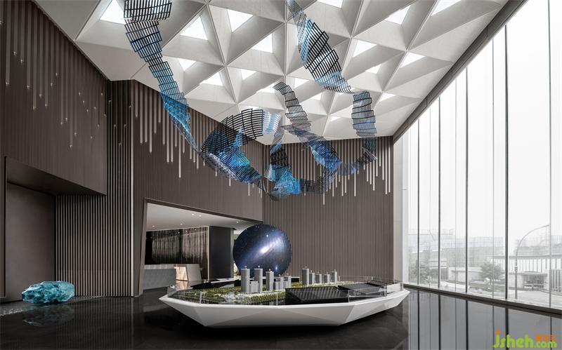 淙淙流水之上,隕石不再?zèng)]有溫度,這是專為旅客進(jìn)行太空穿梭收集的能量石。水石相生,激蕩出宇宙中最原始的能量和秩序。營(yíng)銷中心設(shè)計(jì)沙盤區(qū)一角的藝術(shù)裝置,在水景中放置“藍(lán)色隕石”,通過隕石的棱角與建筑及觀者對(duì)話。太空旅客在此涉取靈感和能量,構(gòu)筑一個(gè)微妙宇宙。