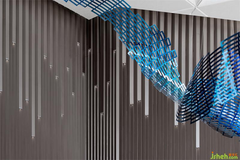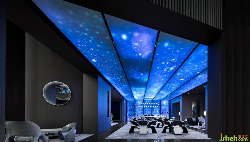 旅客們尚在回味,下一幕場(chǎng)景更為震撼:邁過巨型藍(lán)色行星,到達(dá)沙盤區(qū)。弧形賜予人類,直線歸于上帝。幾何狀鏤空天花分割自然光,照耀在觸手可及的“銀河系”精密金屬材質(zhì)裝置上。仰望星空,體會(huì)宇宙的玄妙,這藍(lán)色的詩(shī)像是生命的詠嘆調(diào),高昂的超脫,低徊的開悟。
