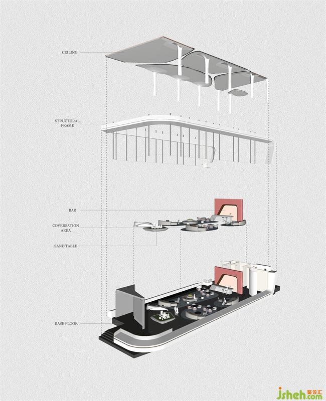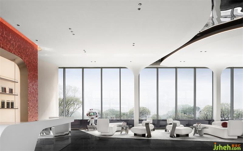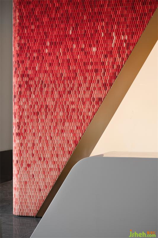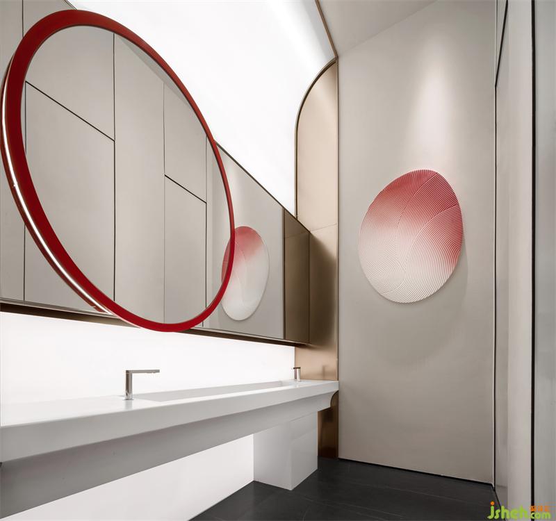 在請(qǐng)上用大面積的紅色基調(diào),在純凈利落的白色背景下加入紅色點(diǎn)綴內(nèi)部空間的雛形,細(xì)節(jié)處輔以不同的新材料,讓那抹代表著火熱的紅色營(yíng)造視覺(jué)焦點(diǎn)??臻g天花幾條界定空間的弧線創(chuàng)造了視線與動(dòng)線的延伸并讓日光灑于其上而形成時(shí)間的印跡。